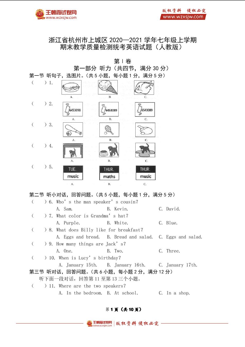 浙江省杭州市上城区2020—2021学年七年级上学期期末教学质量检测统考英语试题(人教版)【无听力音频】_R211230104137523