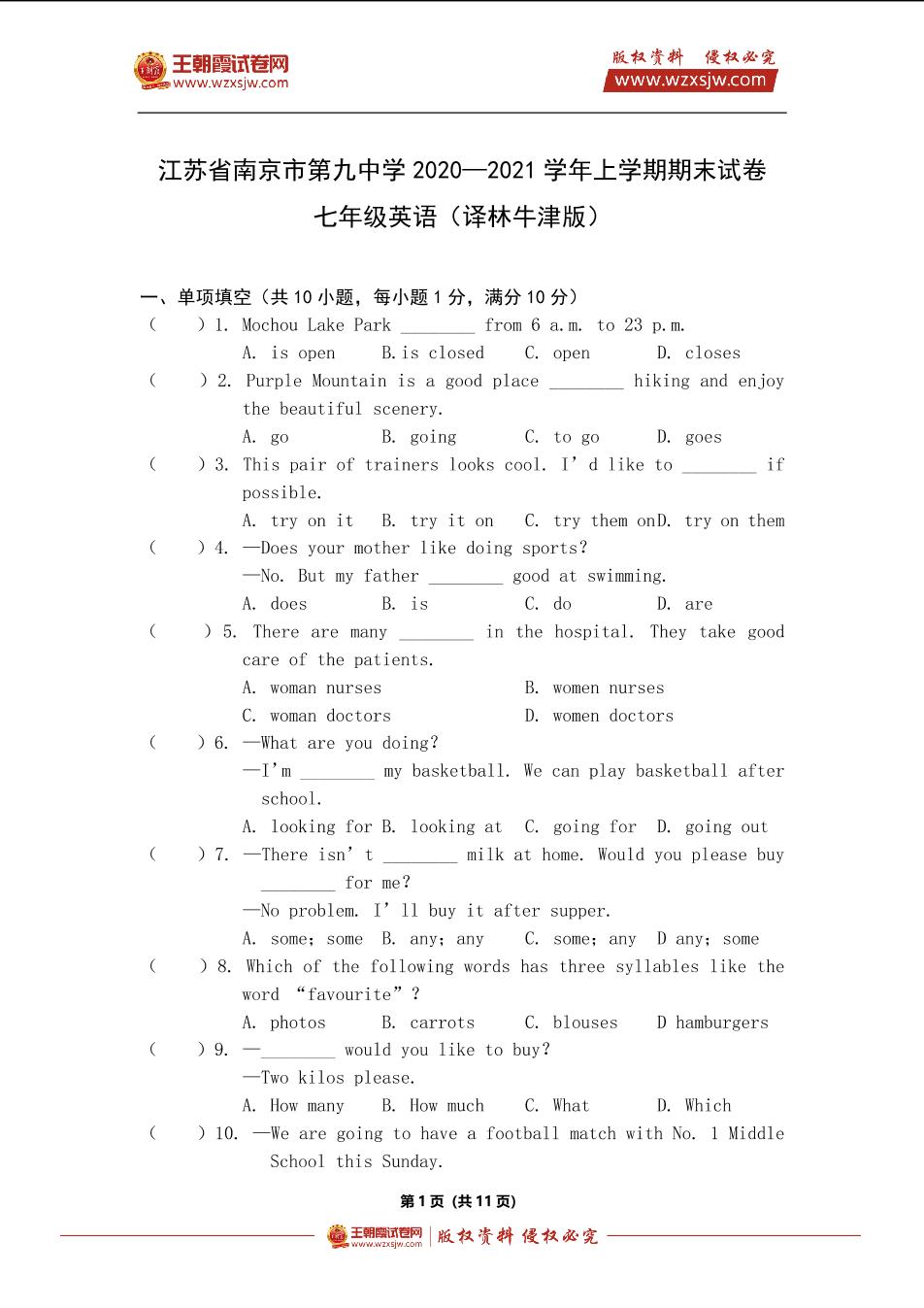 江苏省南京市第九中学2020—2021学年上学期期末试卷七年级英语(译林牛津版)【无听力音频】_R211230104137099