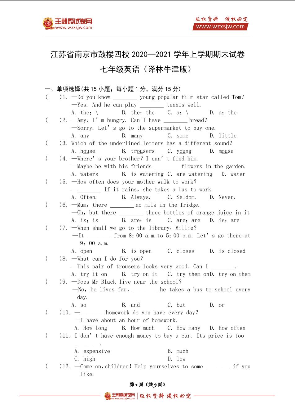 江苏省南京市鼓楼四校2020—2021学年上学期期末试卷七年级英语(译林牛津版)【无听力音频】_R211230104137256