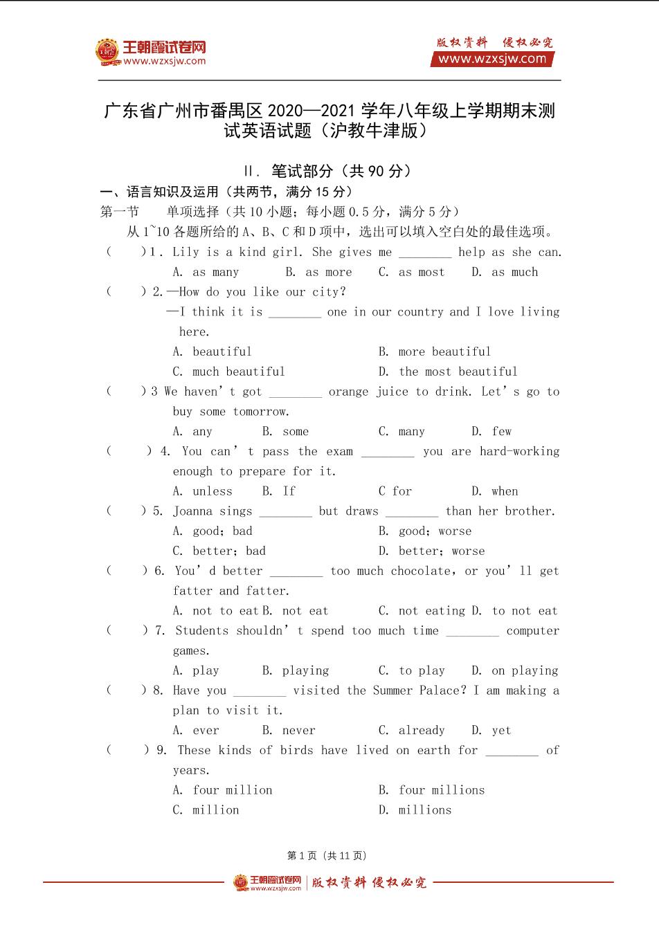广东省广州市番禺区2020—2021学年八年级上学期期末测试英语试题(沪教牛津版)【无听力音频】_R211230104138387