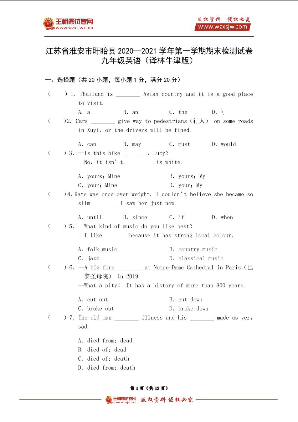 江苏省淮安市盱眙县2020—2021学年第一学期期末检测试卷九年级英语(译林牛津版)【无听力音频】_R211230104138736