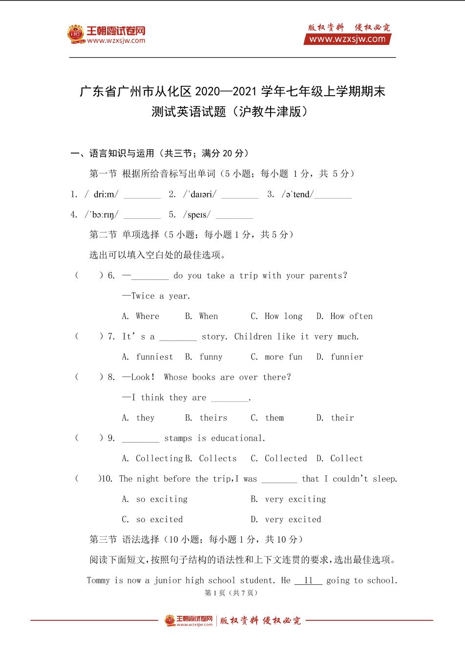 广东省广州市从化区2020—2021学年七年级上学期期末测试英语试题(沪教牛津版)【无听力音频】_R211230104139704