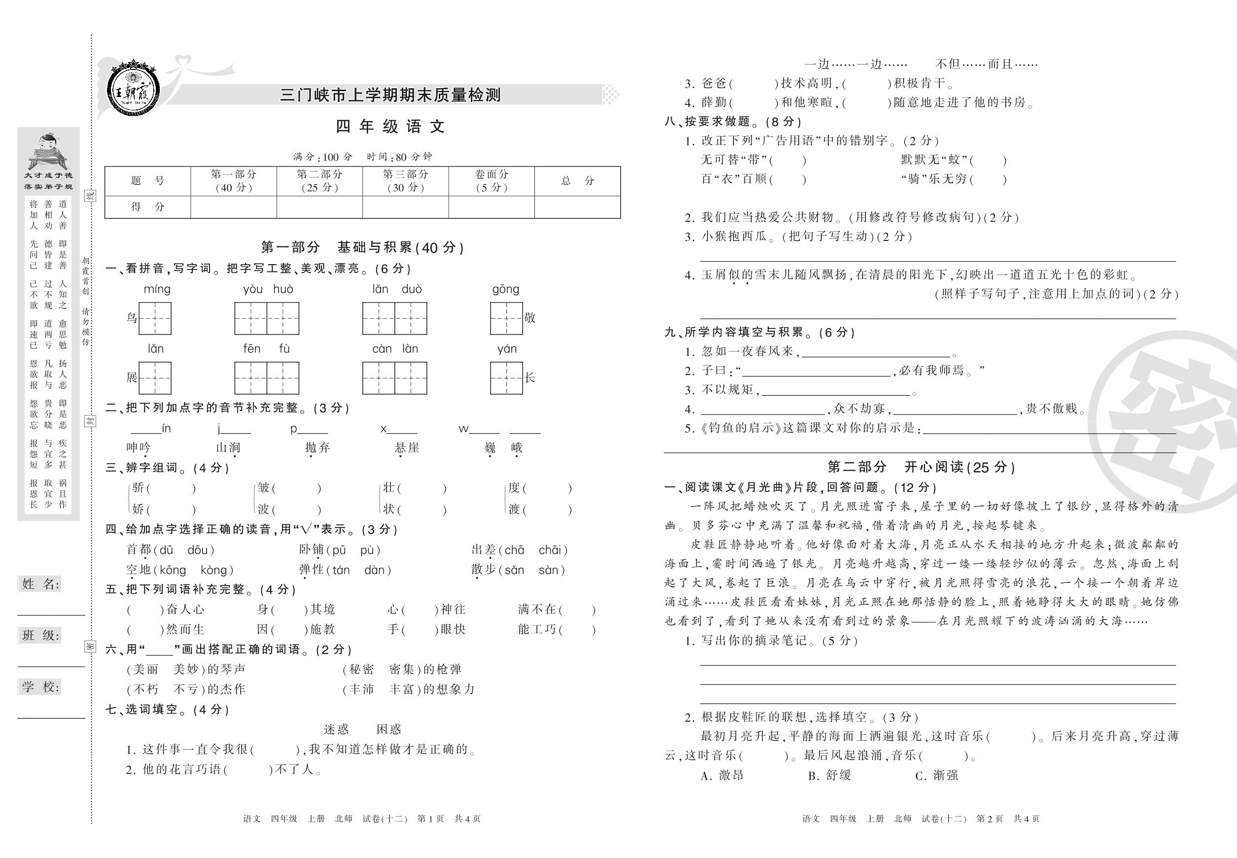 四年级语文北师版上册期末卷