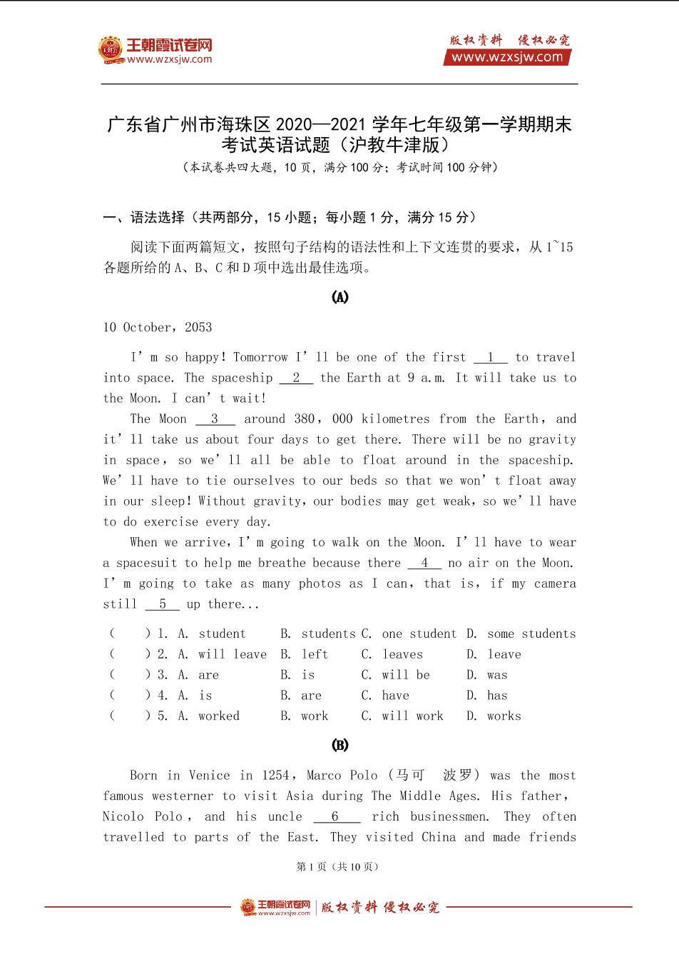 广东省广州市海珠区2020—2021学年七年级第一学期期末考试英语试题(沪教牛津版)【无听力音频】_R211230104139909