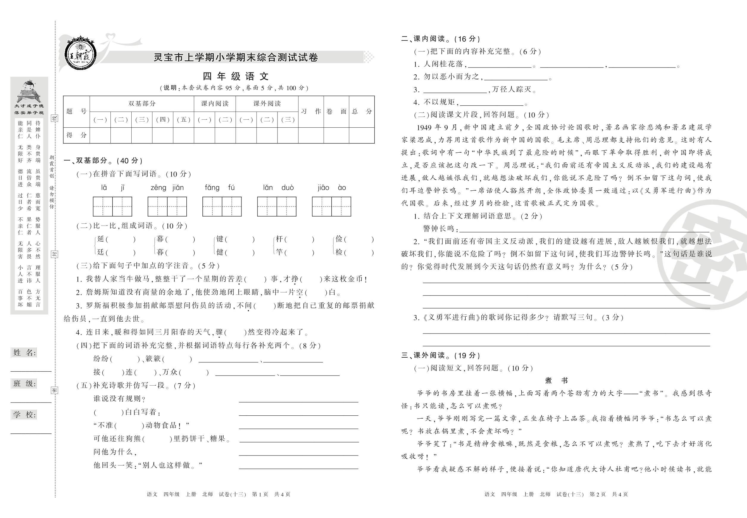 2016-2017学年第一学期灵宝市四年级语文试卷(北师版)【13】