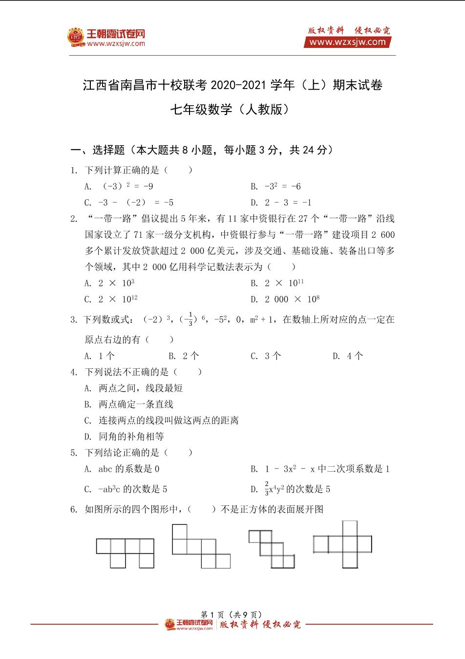江西省南昌市十校联考2020-2021学年(上)期末试卷七年级数学(人教版)