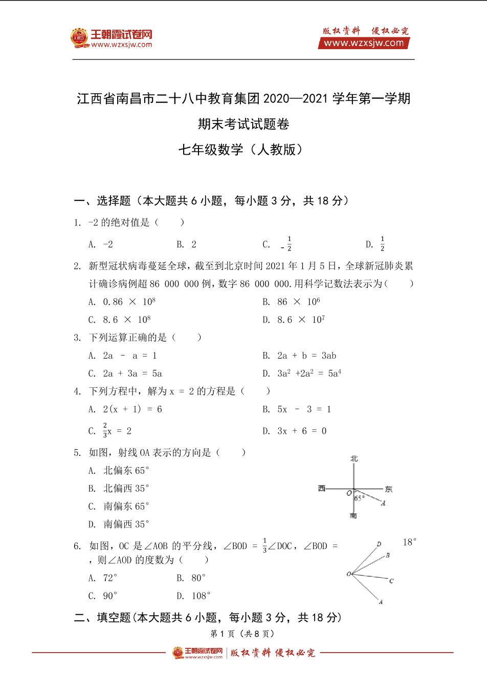 江西省南昌市二十八中教育集团2020—2021学年第一学期期末考试试题卷七年级数学(人教版)