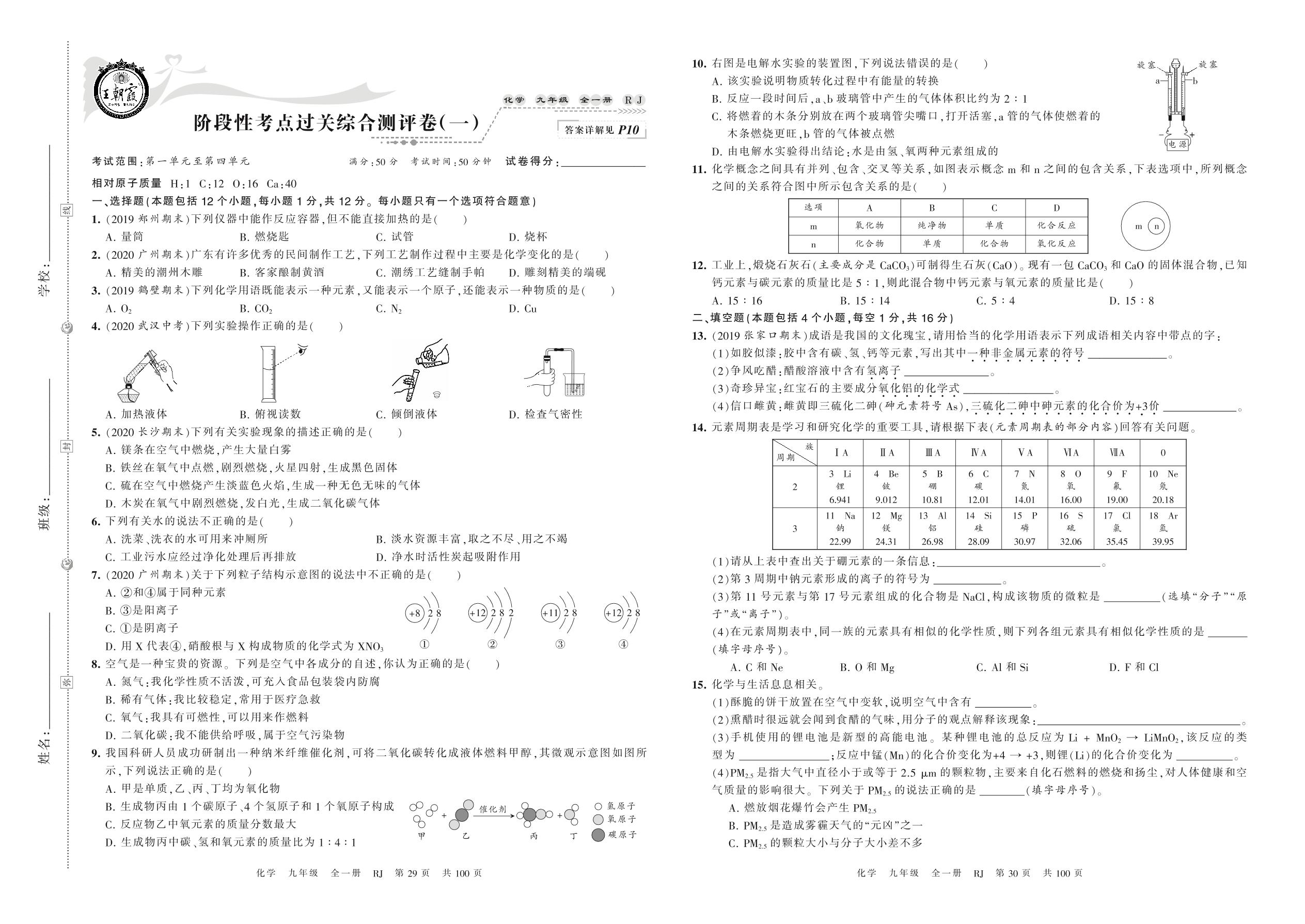 2021秋上册九年级化学人教版 阶段性考点过关综合测评卷(一)