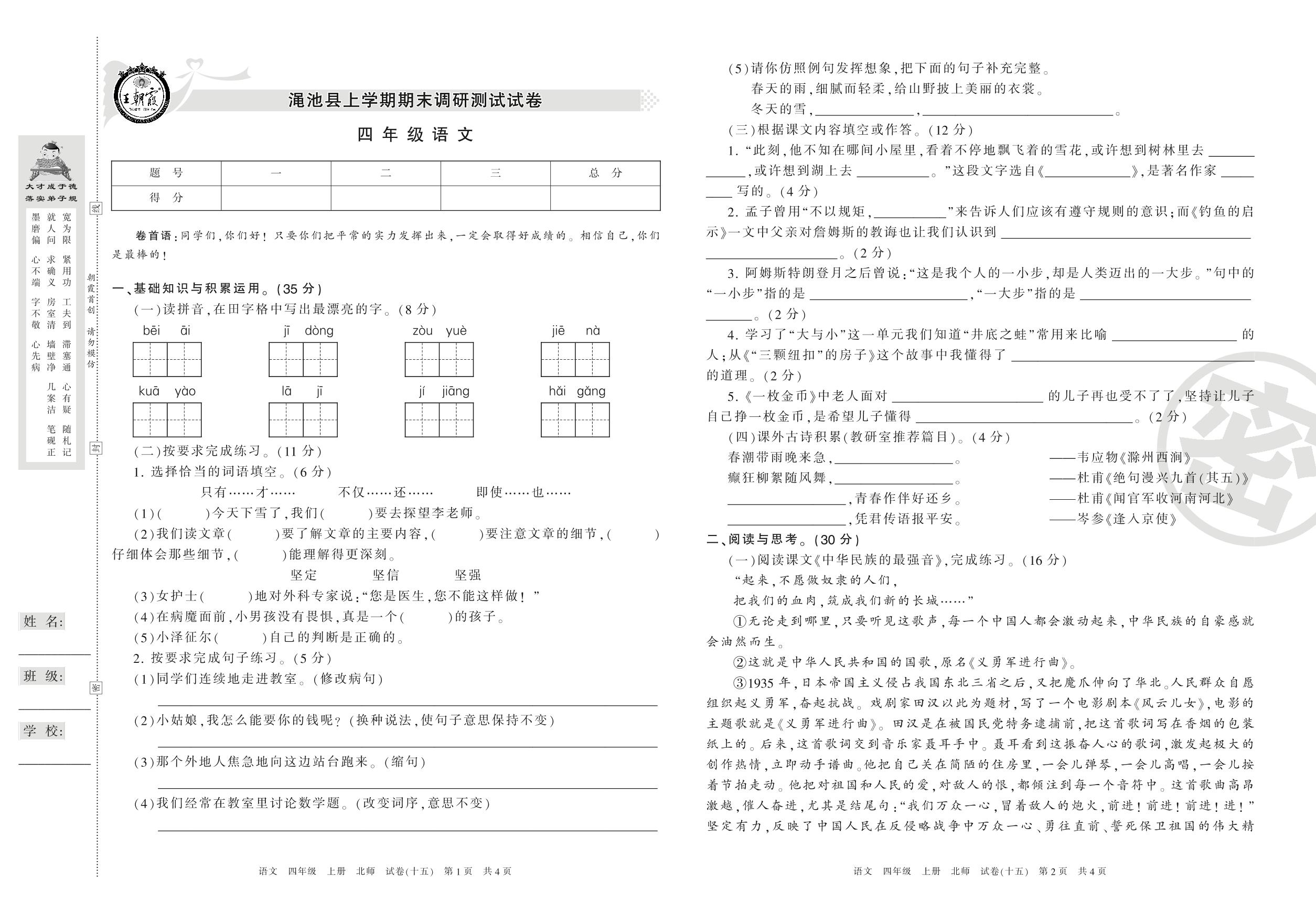 2016-2017学年第一学期三门峡市渑池县四年级语文试卷(北师版)【15】