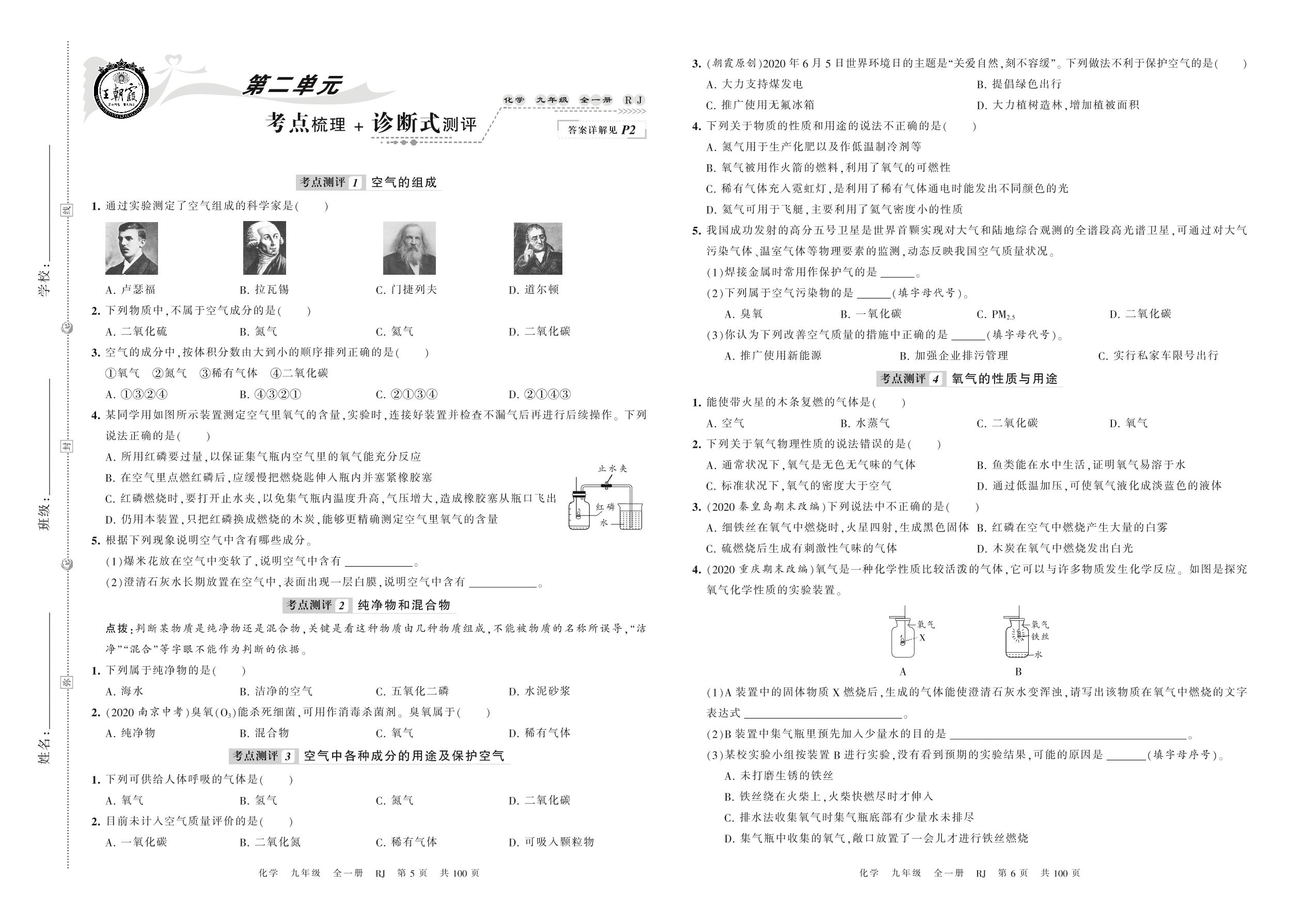2021秋上册九年级化学人教版 第二单元 考点梳理 + 诊断式测评
