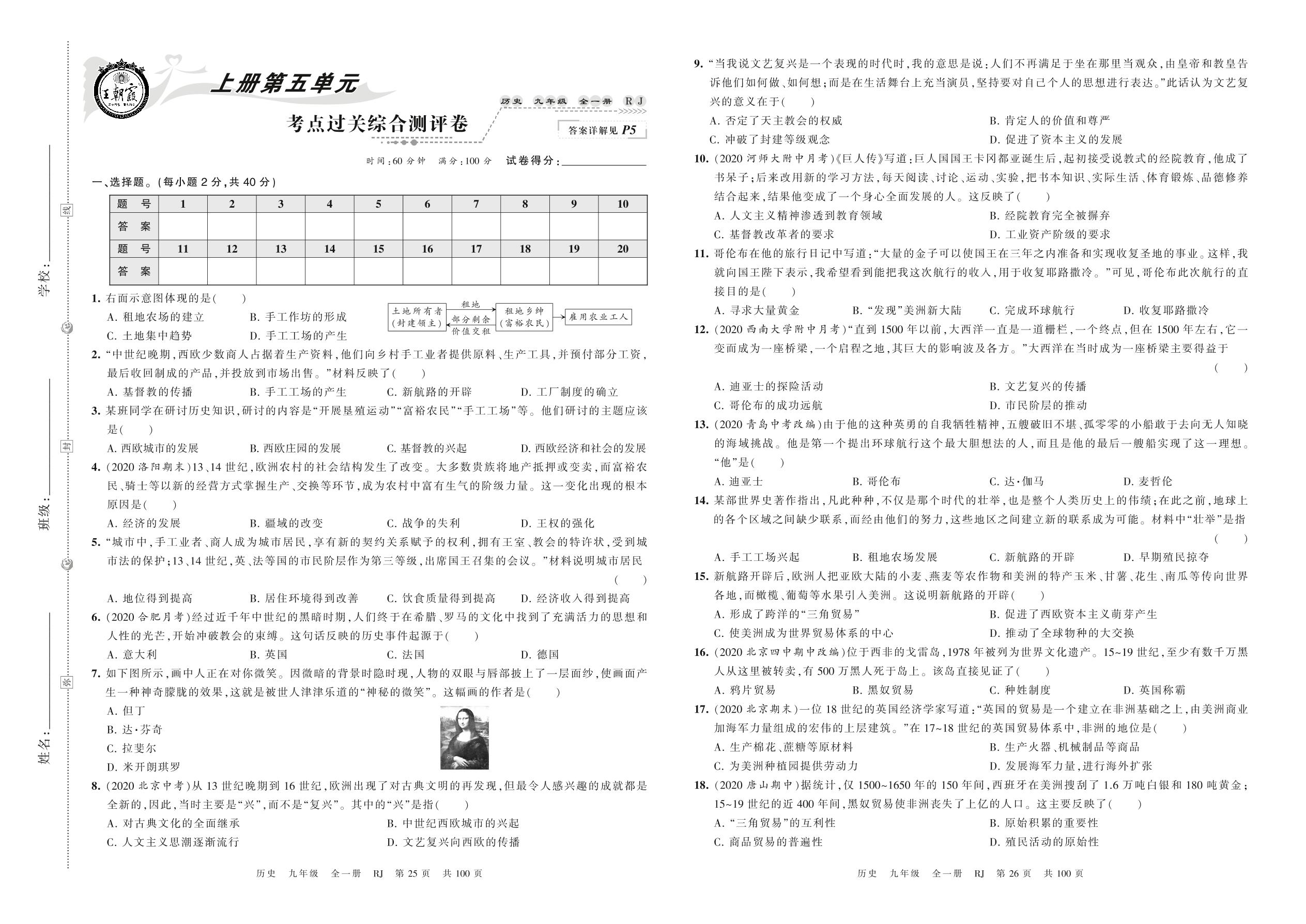 2021秋上册九年级历史人教版 第五单元 考点过关综合测评卷