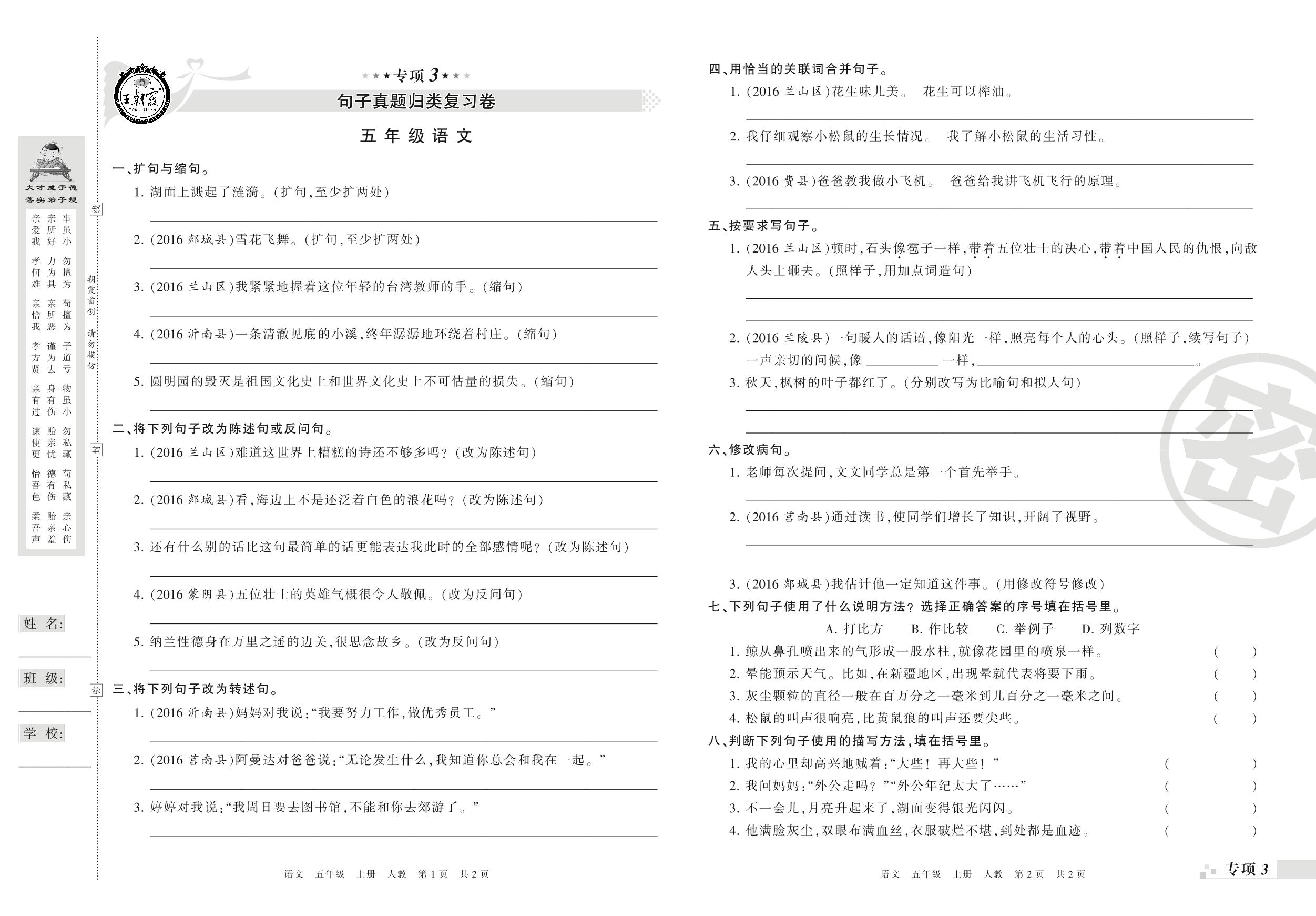 王朝霞期末专项卷——句子、课文内容真题归类复习五年级上册语文(人教版)【0】