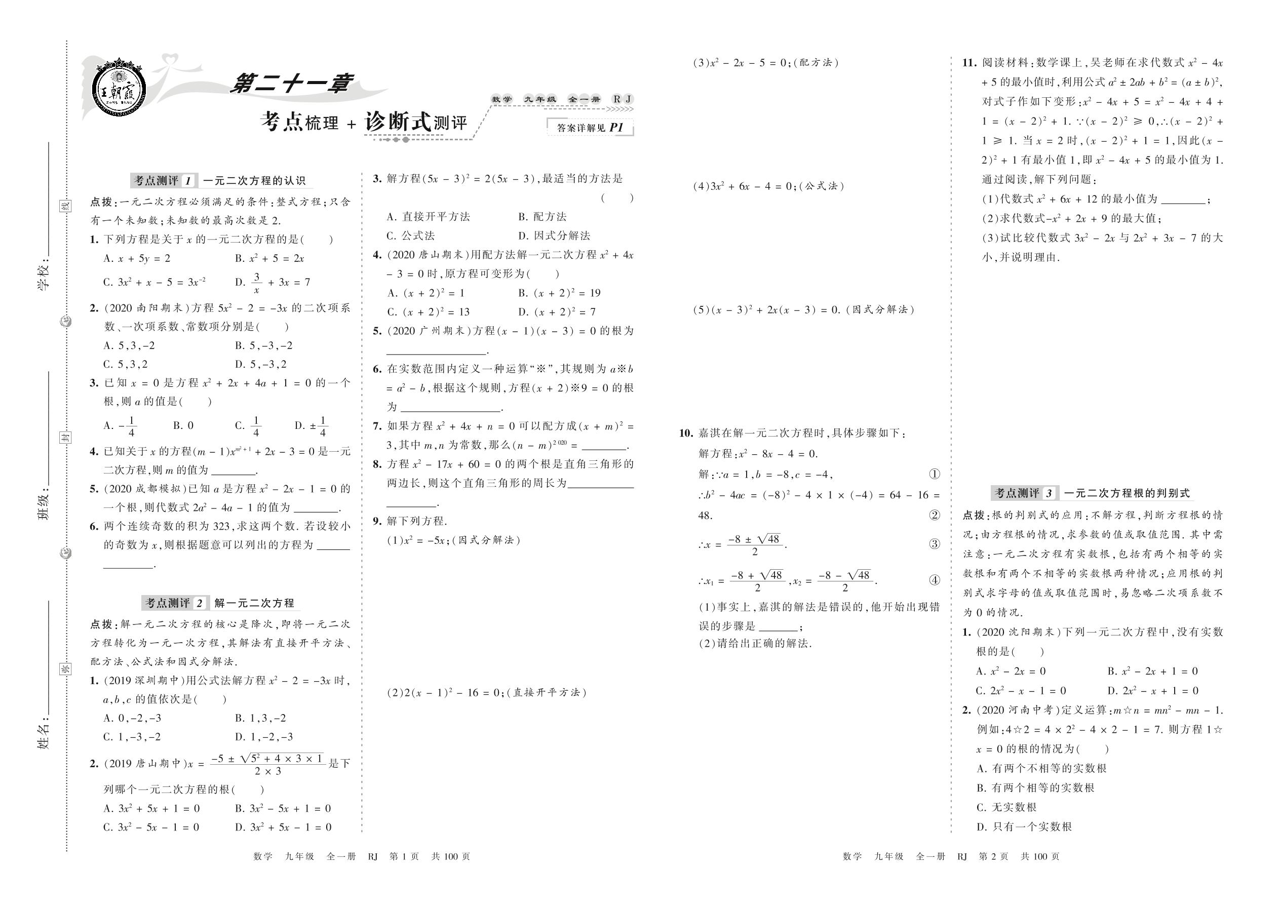2021秋上册九年级数学人教版 第二十一章 考点梳理 + 诊断式测评