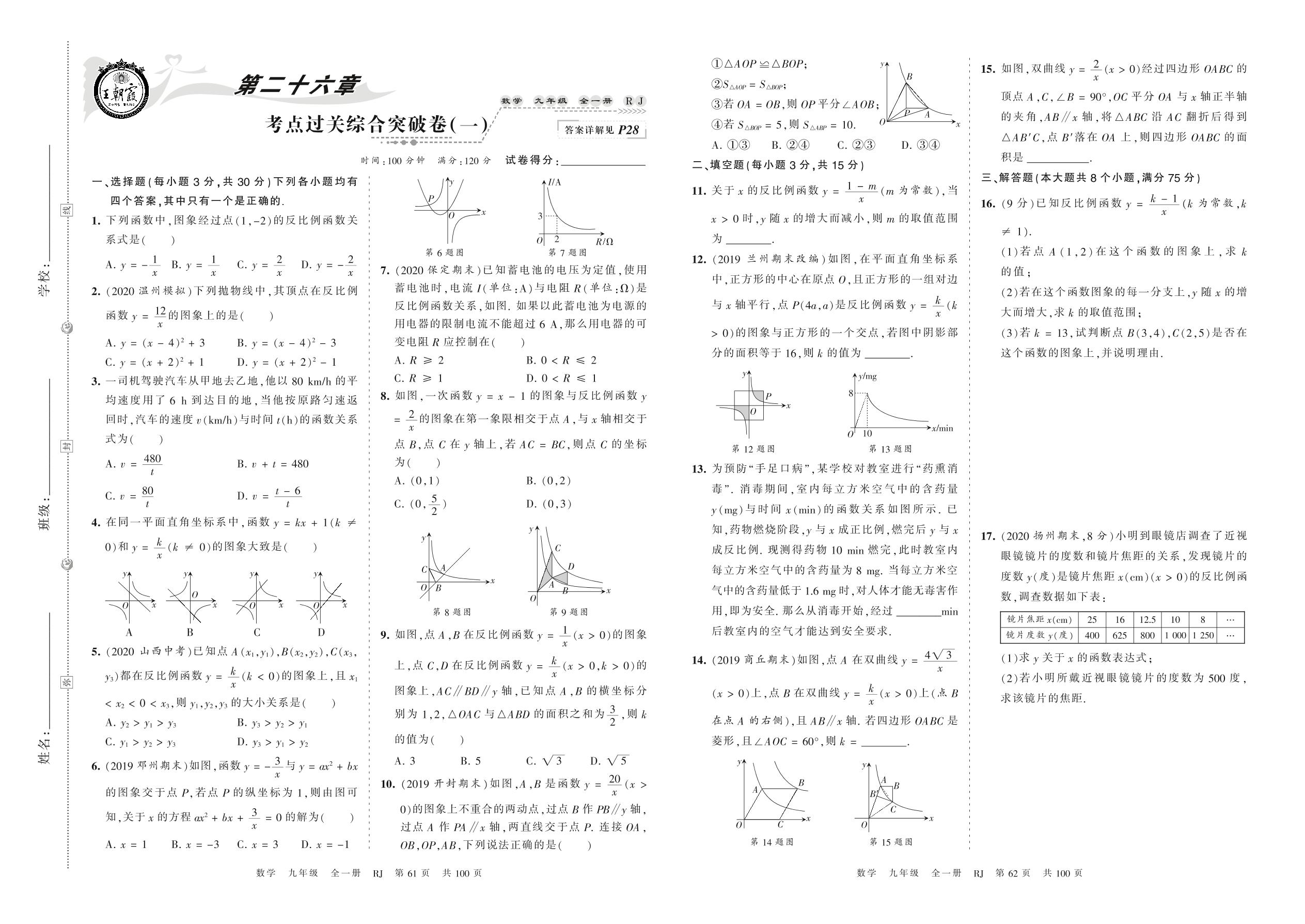 2022春下册九年级数学人教版 第二十六章 考点过关综合突破卷(一)