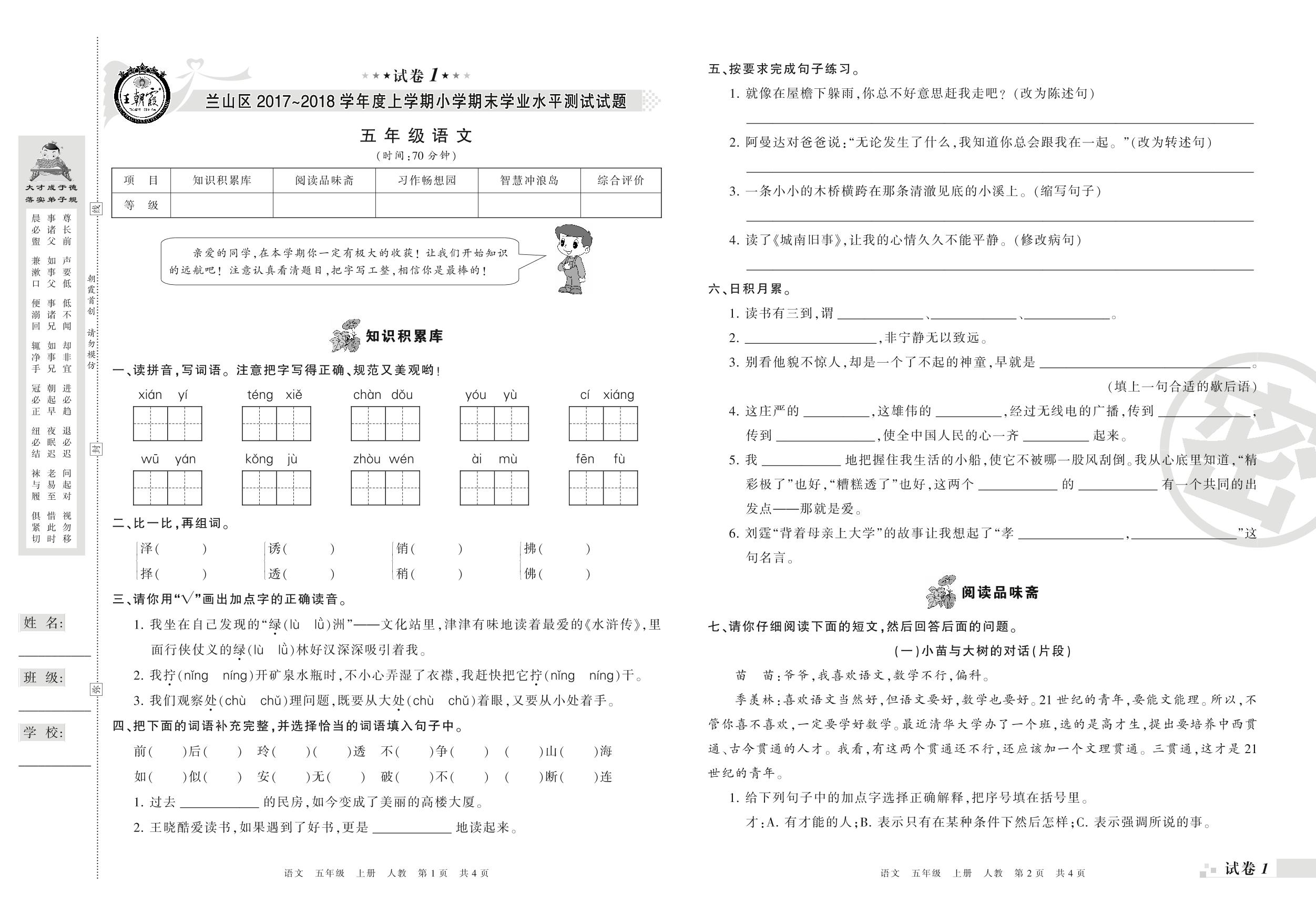2017-2018学年第一学期临沂市兰山区五年级语文试卷(人教版)【1】