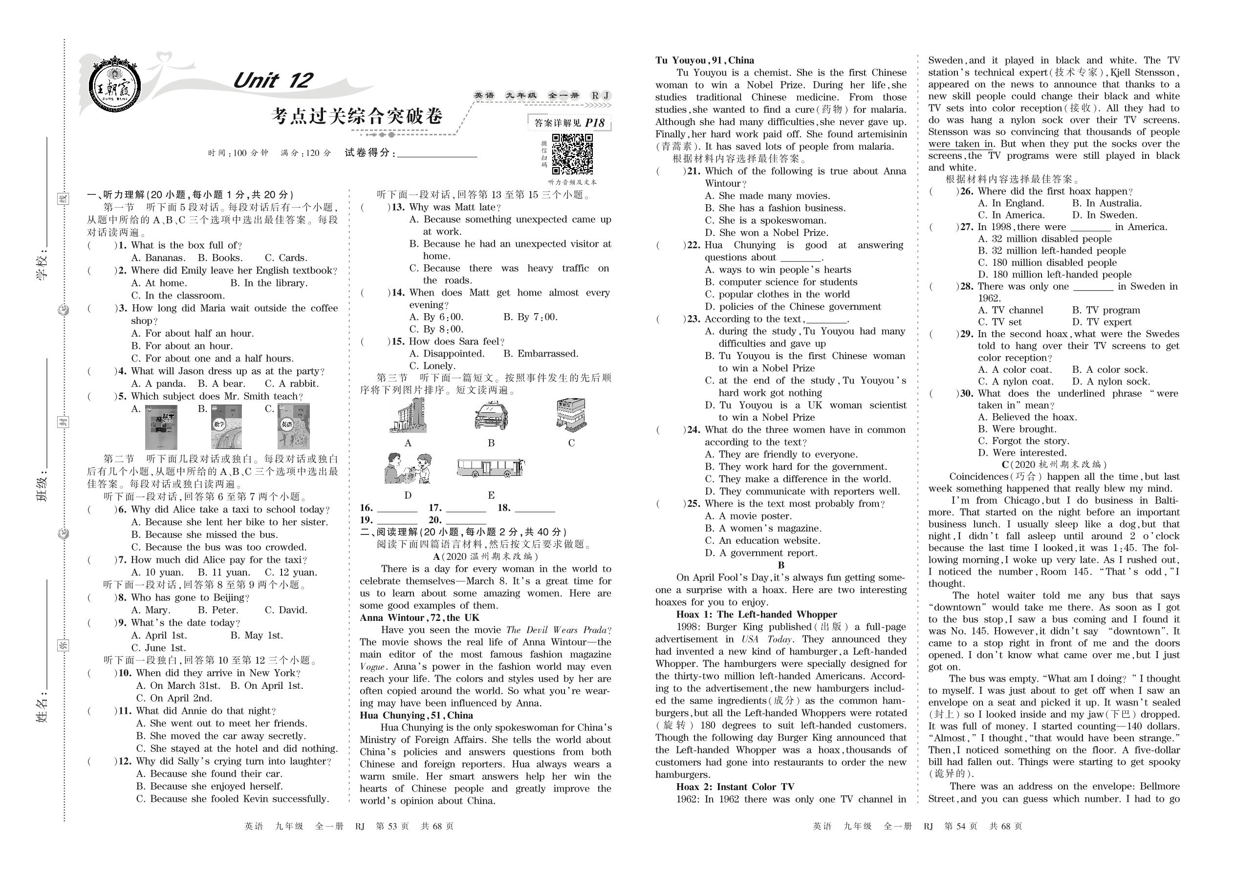 2021-2022学年九年级英语人教版 Unit 12 考点过关综合突破卷