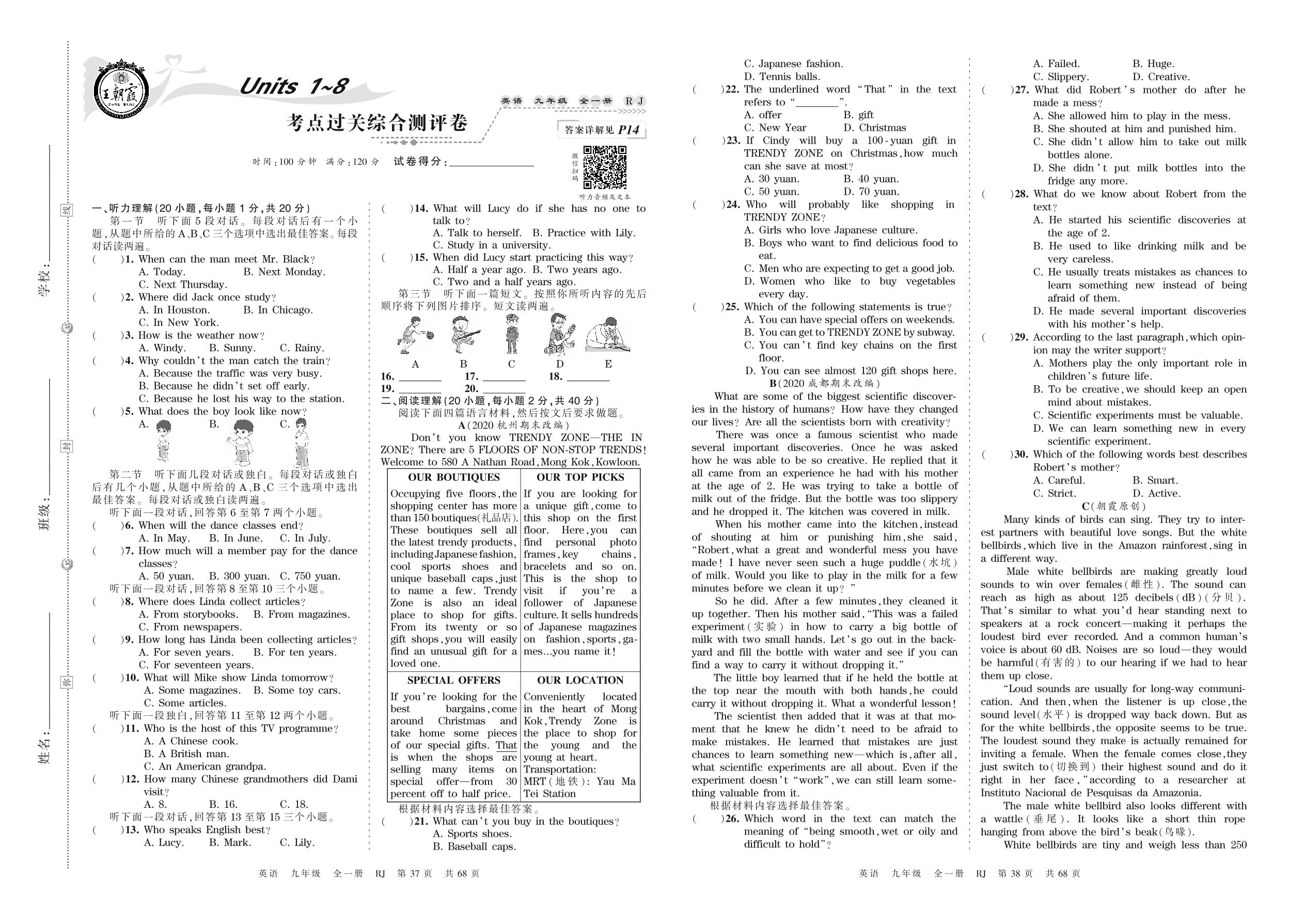 2021-2022学年九年级英语人教版 Units 1~8 考点过关综合测评卷