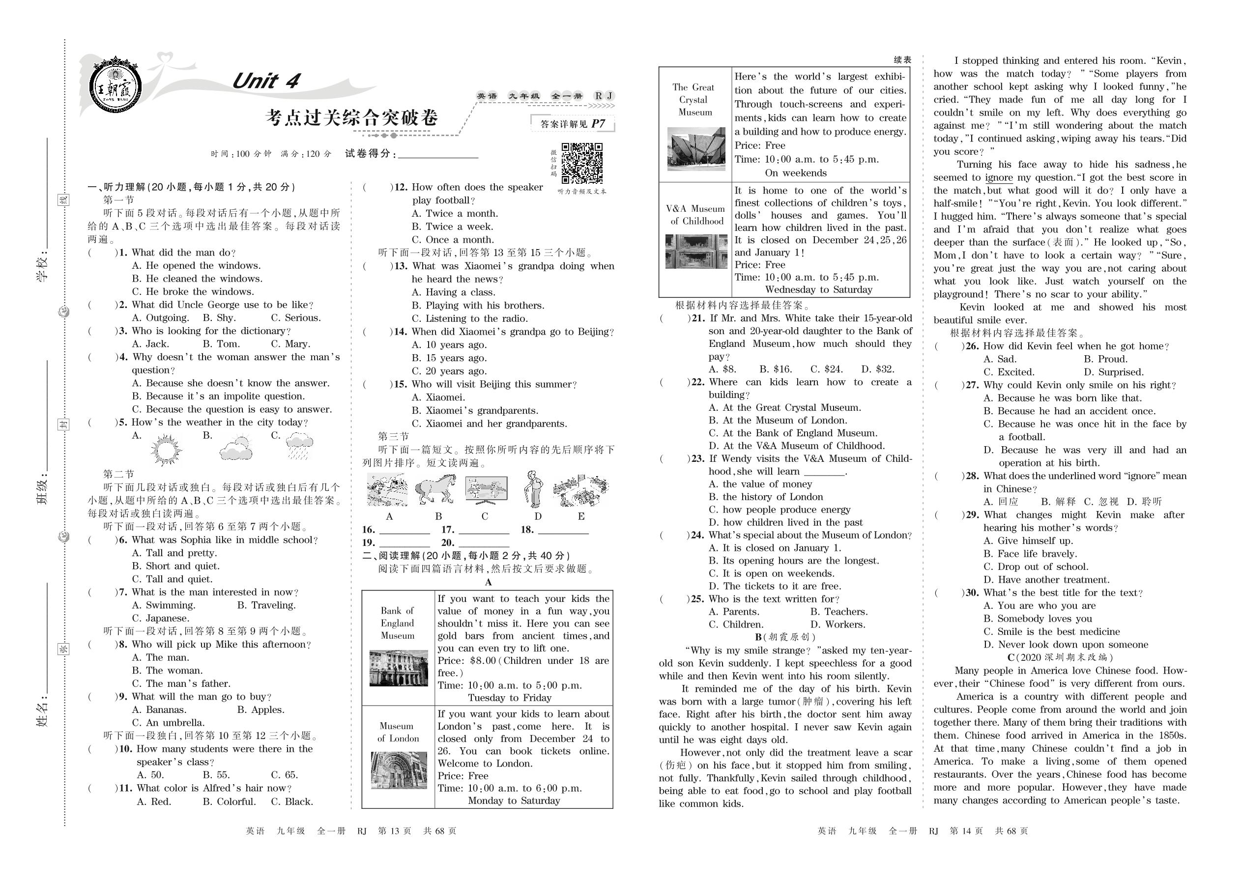 2021-2022学年九年级英语人教版 Unit 4 考点过关综合突破卷
