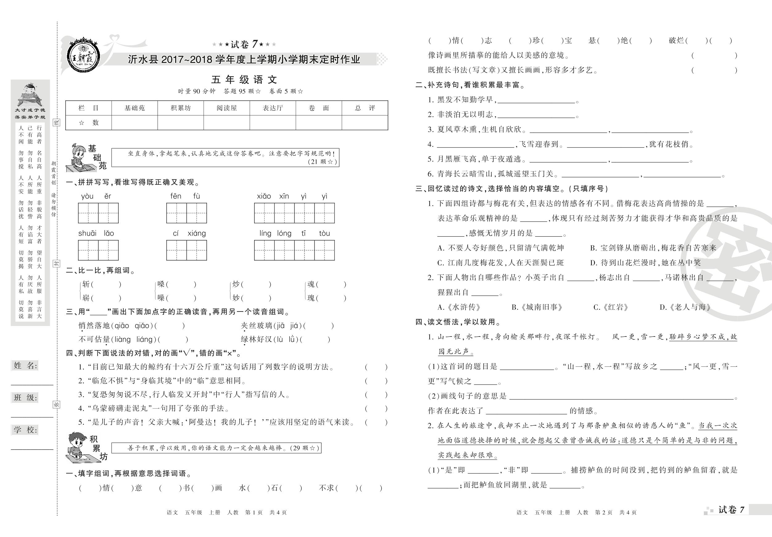 2017-2018学年第一学期临沂市沂水县五年级语文试卷(人教版)【7】