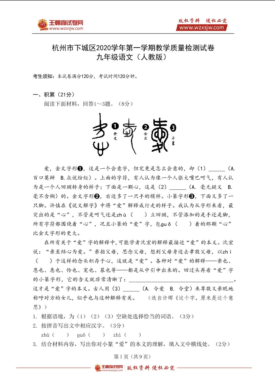 杭州市下城区2020学年九年级第一学期教学质量检测语文试卷(人教版)