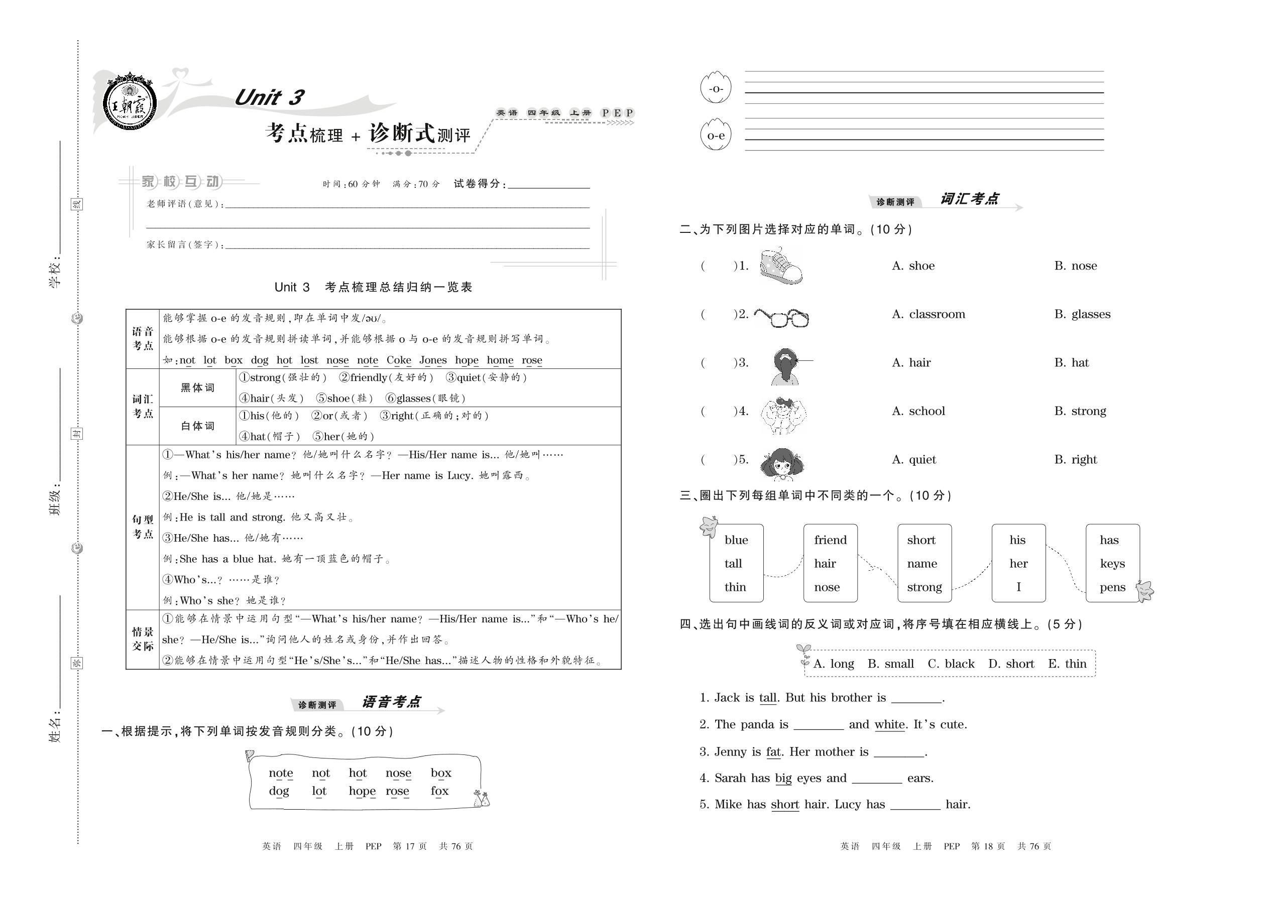 2021上册四年级英语人教PEP版 Unit 3 考点梳理 + 诊断式测评