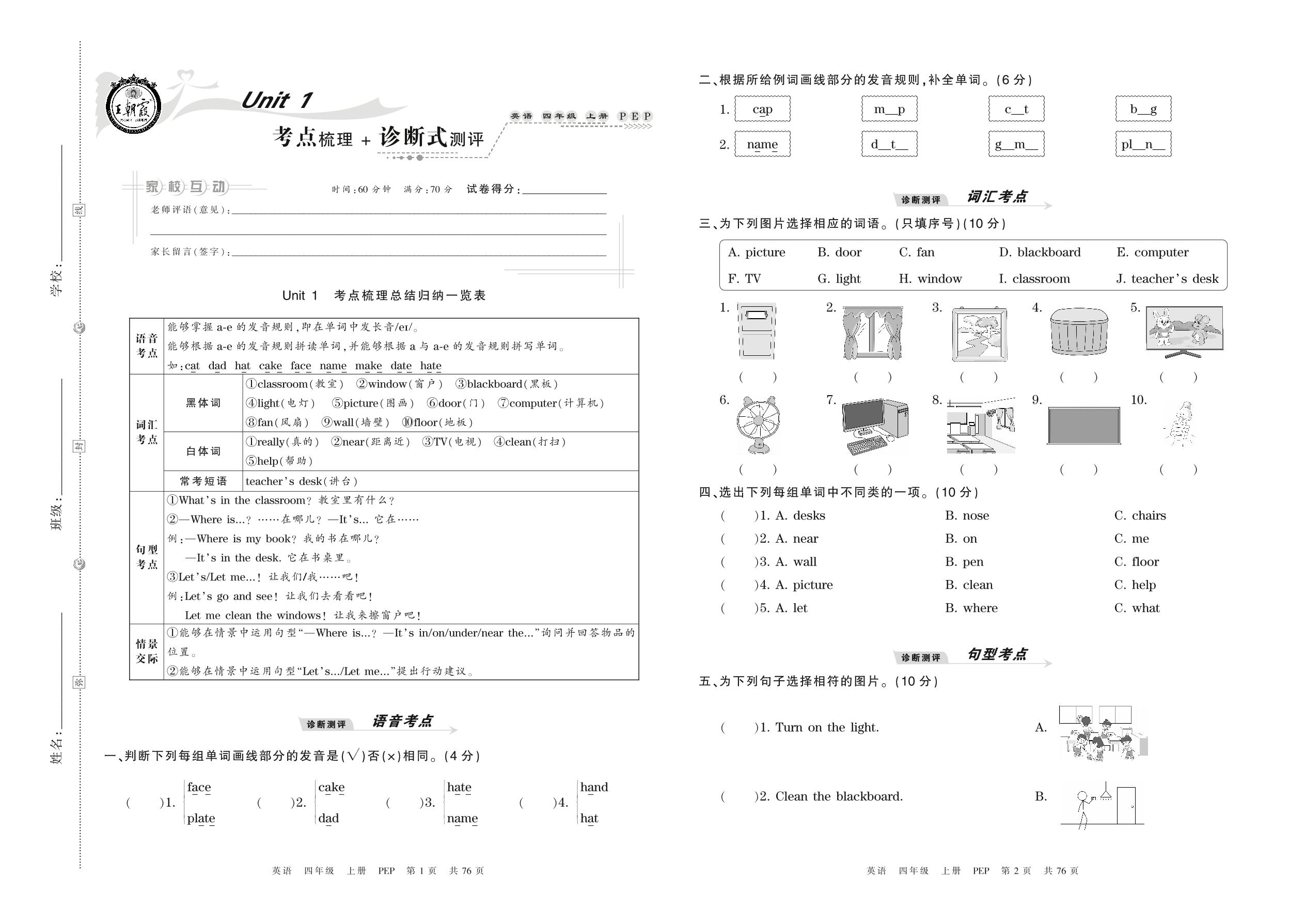 2021上册四年级英语人教PEP版 Unit 1 考点梳理 + 诊断式测评