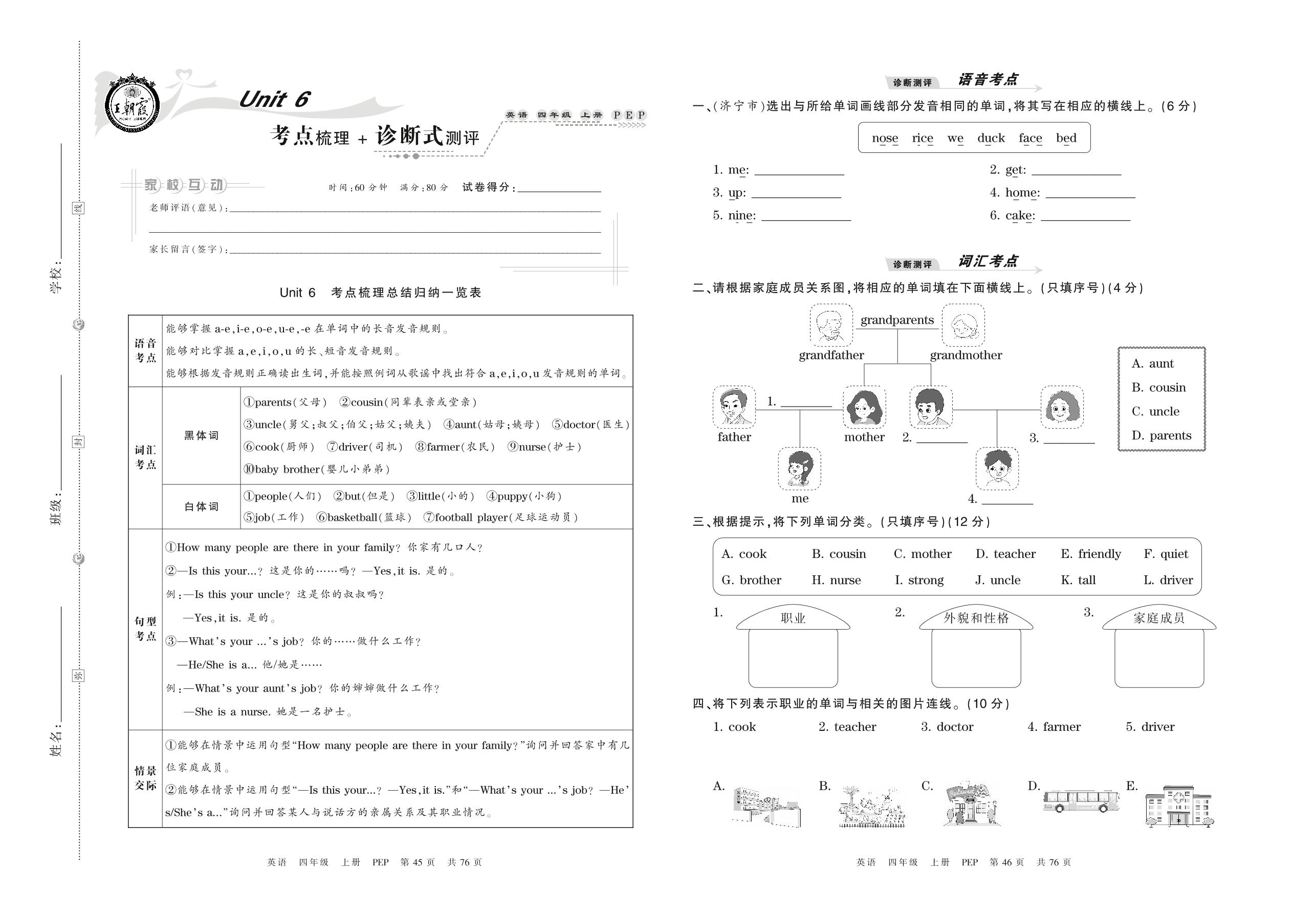 2021上册四年级英语人教PEP版 Unit 6 考点梳理 + 诊断式测评