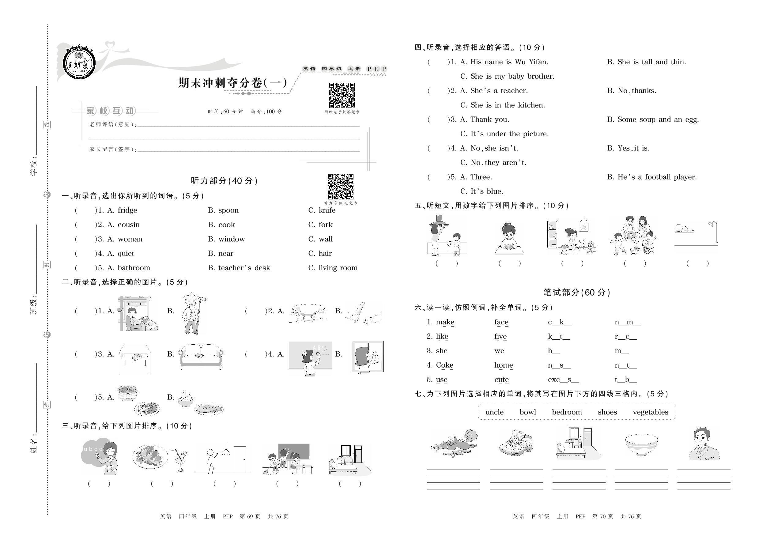 四年级英语人教PEP版(三起始)上册期末卷