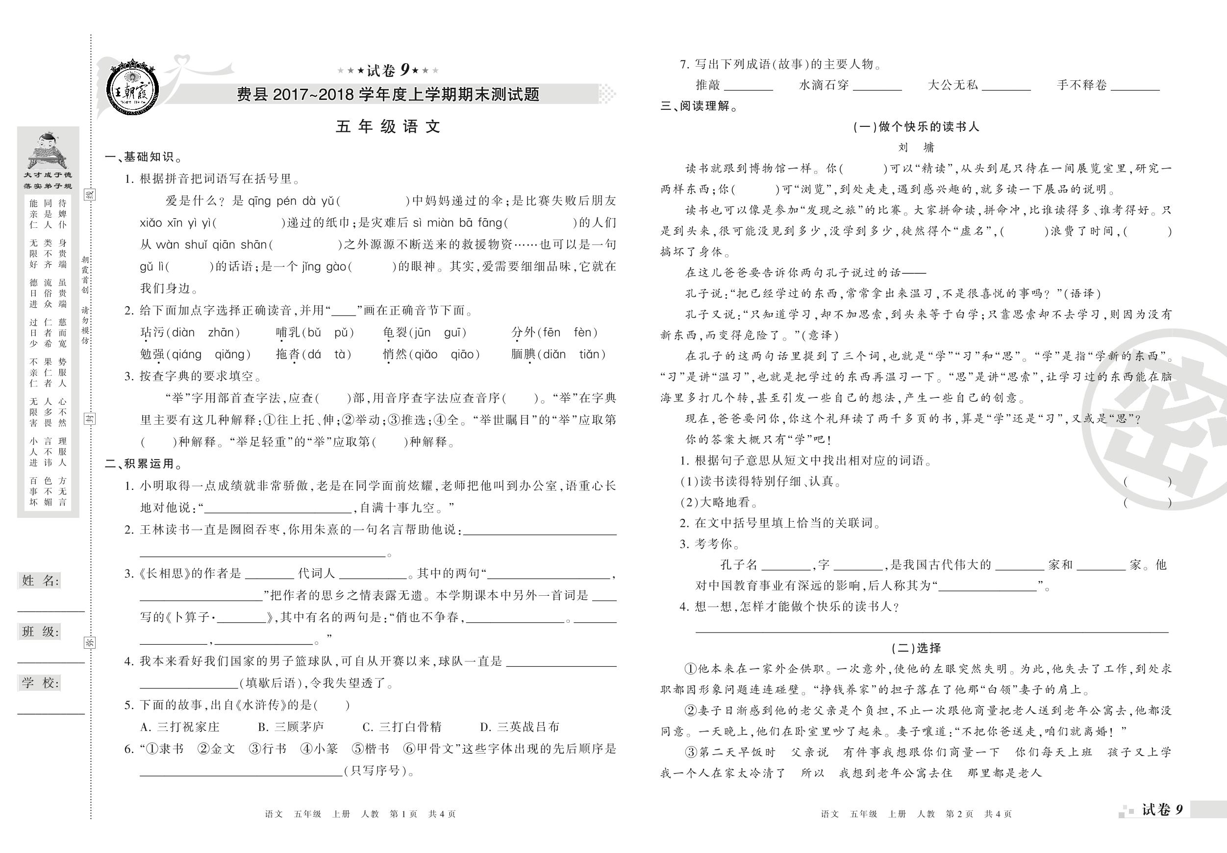 2017-2018学年第一学期临沂市费县五年级语文试卷(人教版)【9】