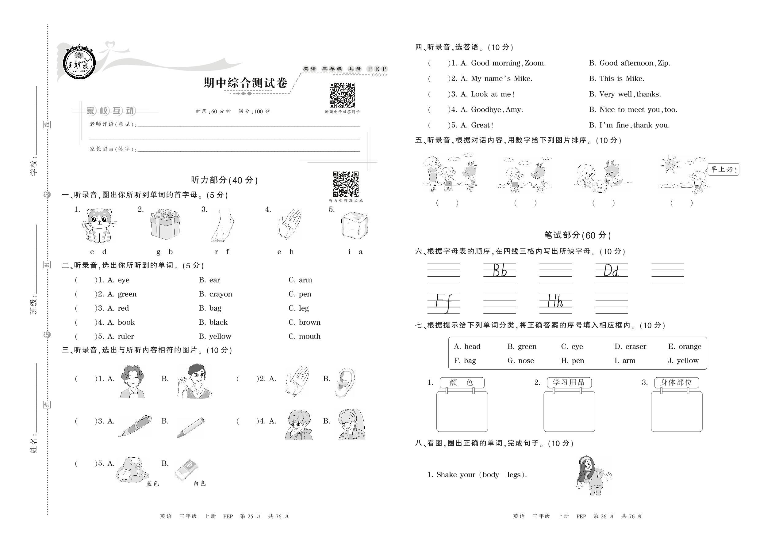 2021上册三年级英语人教PEP版 期中综合测试卷