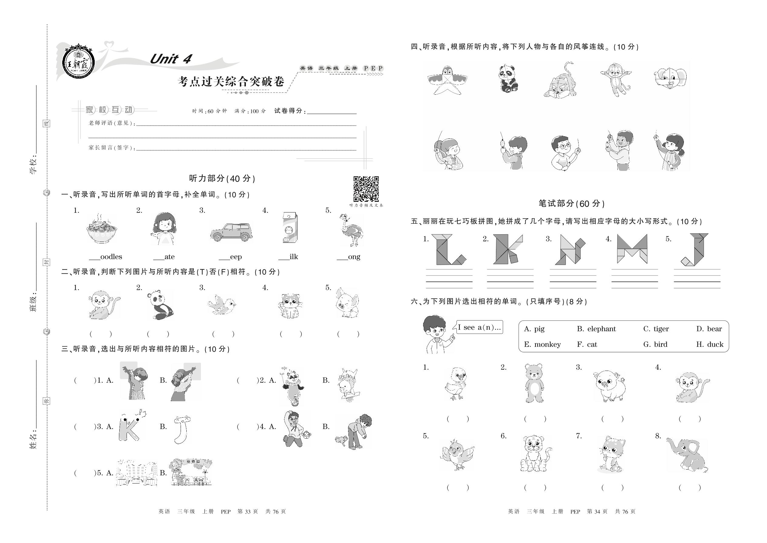 三年级英语人教PEP版(三起始)上册单元卷