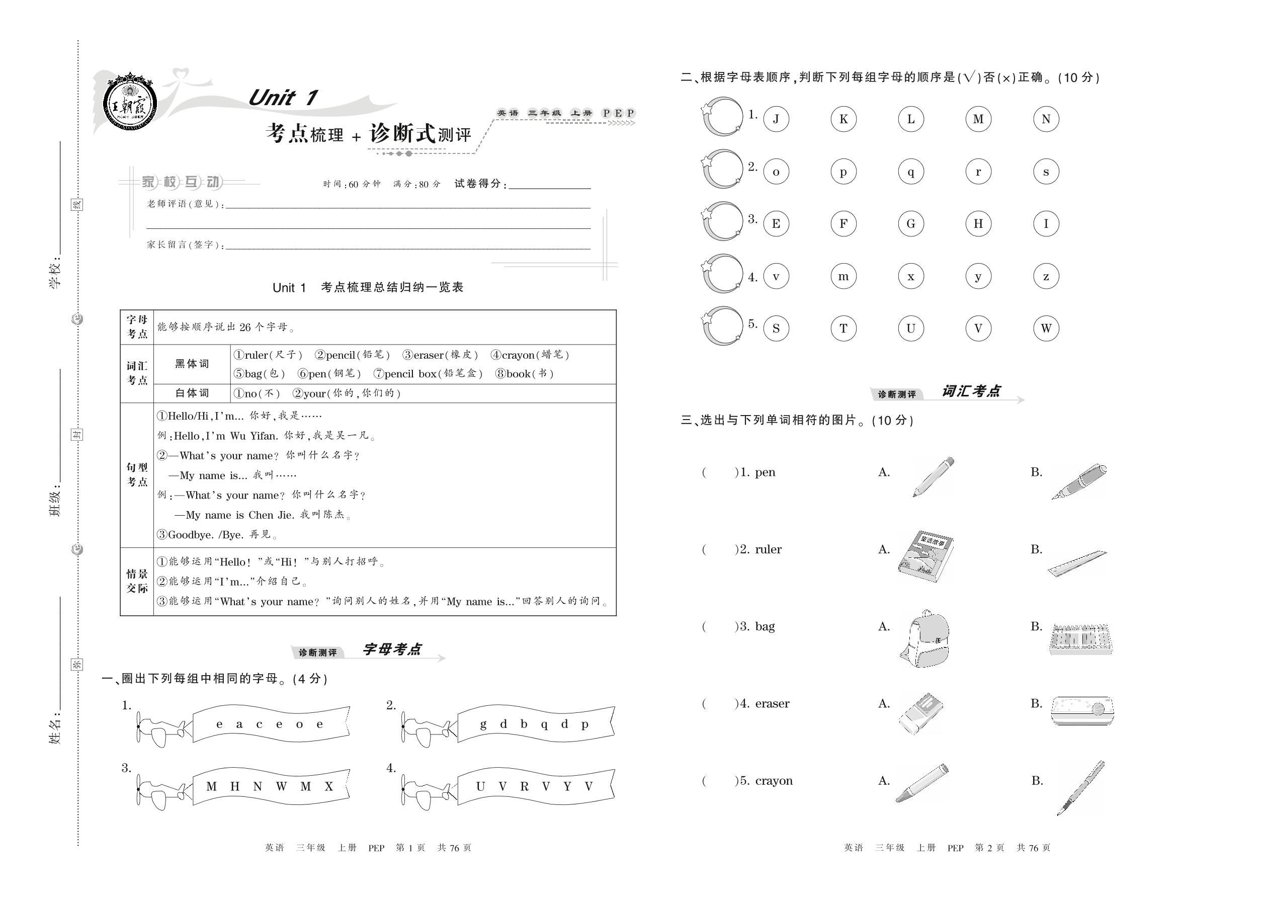 2021上册三年级英语人教PEP版 Unit 1 考点梳理 + 诊断式测评