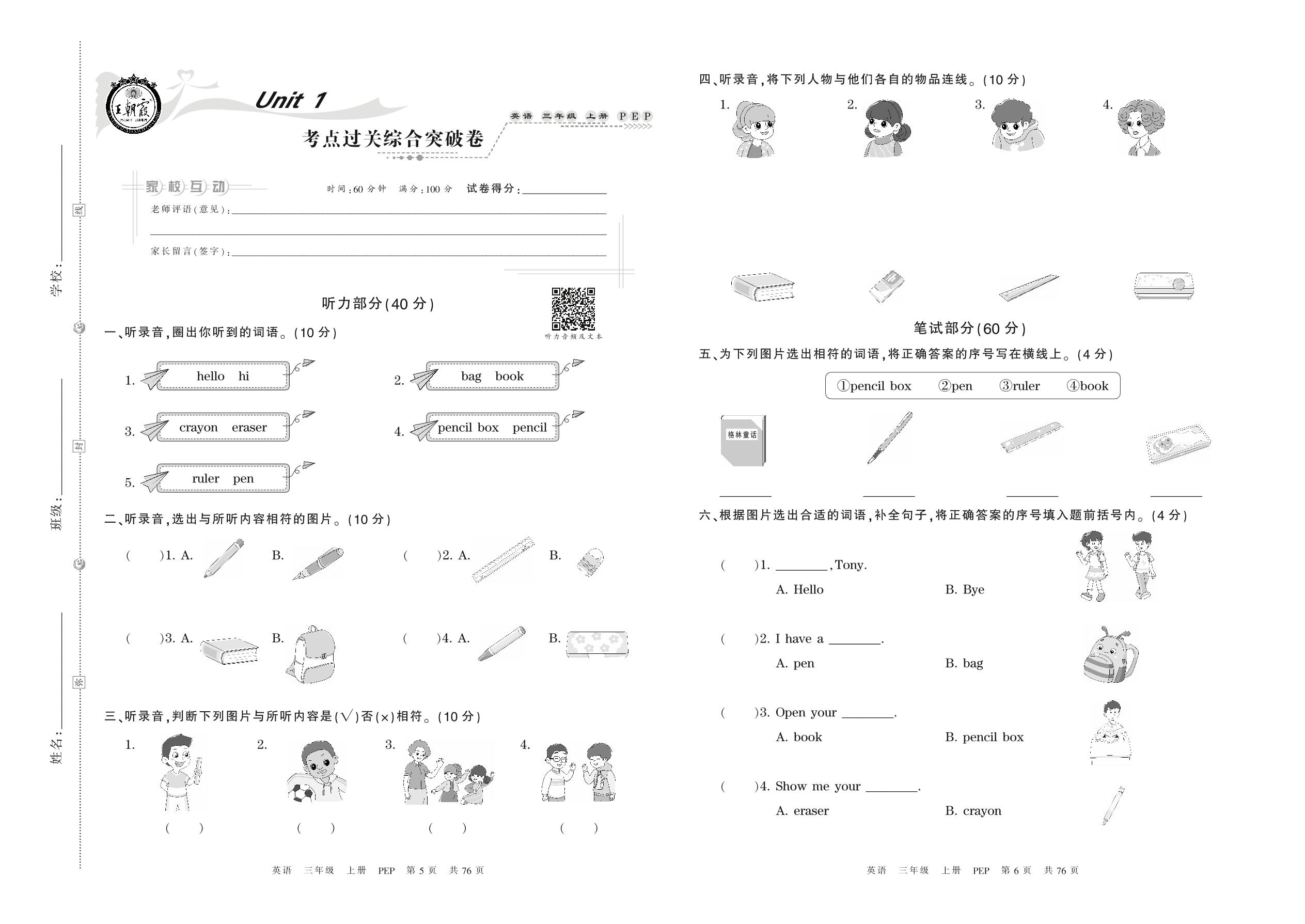 三年级英语人教PEP版(三起始)上册单元卷