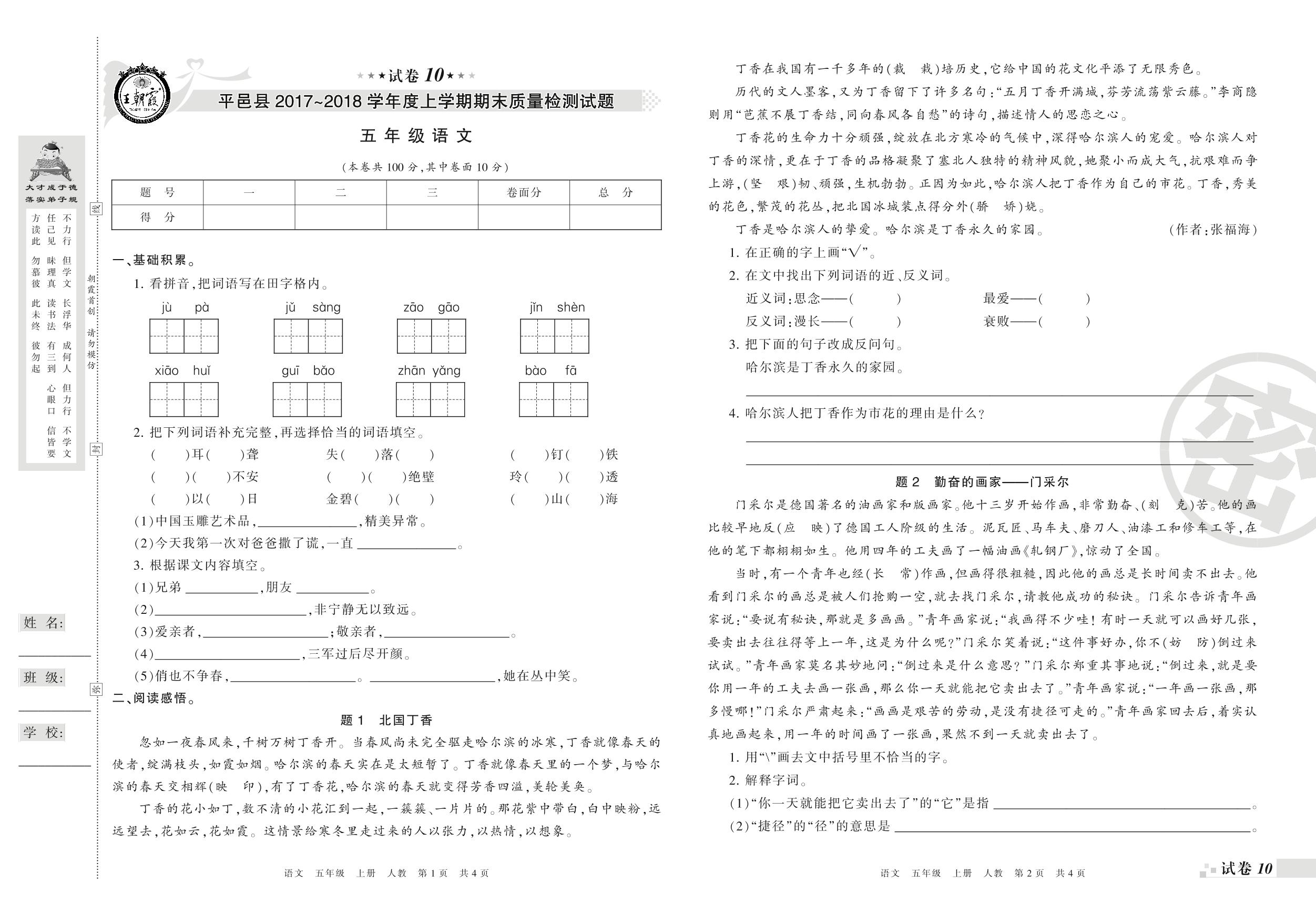 2017-2018学年第一学期临沂市平邑县五年级语文试卷(人教版)【10】