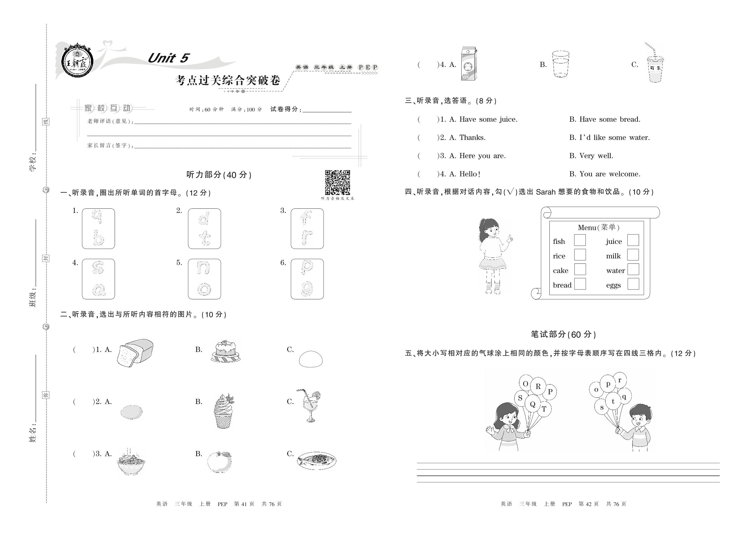 2021上册三年级英语人教PEP版 Unit 5 考点过关综合突破卷