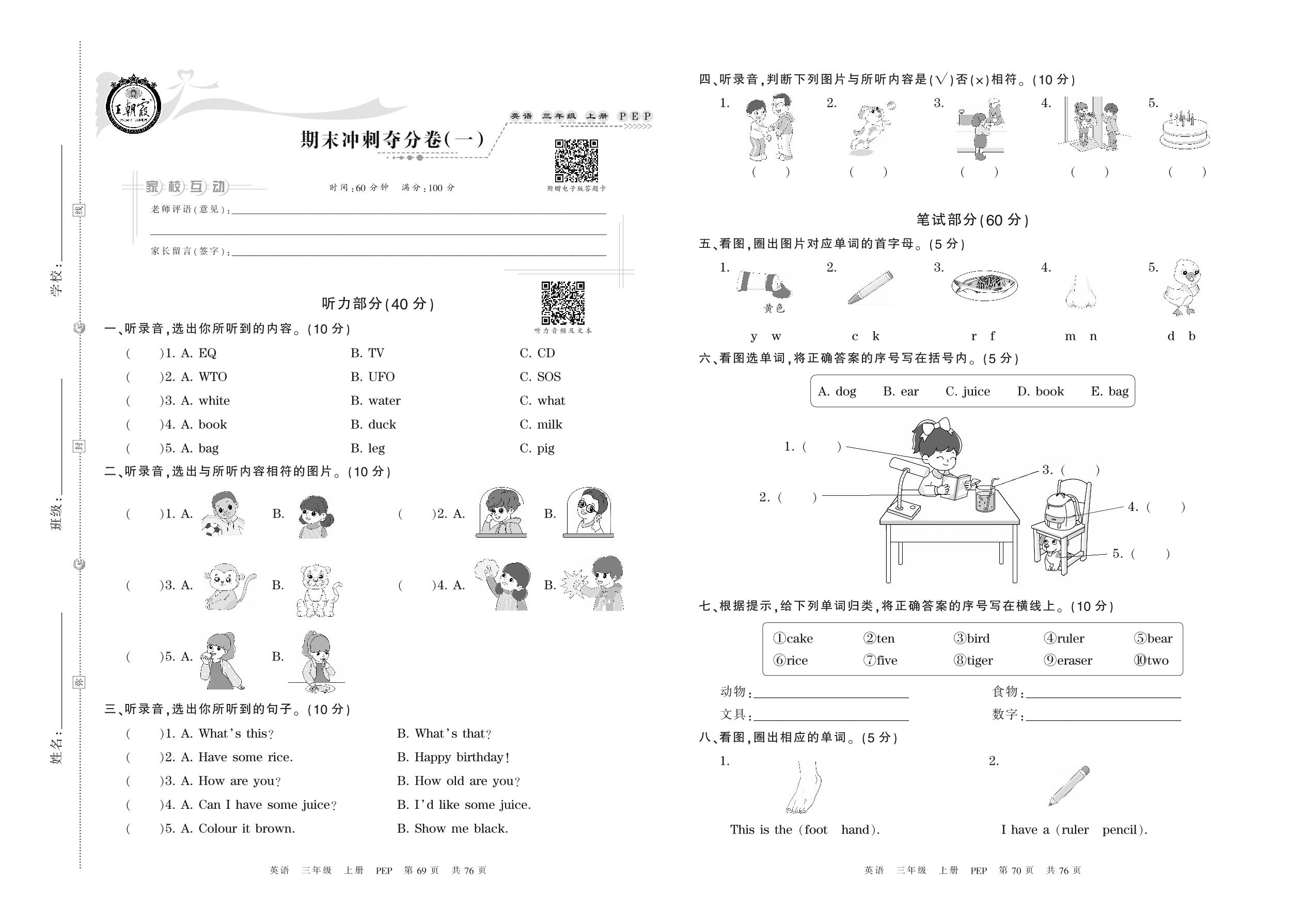 2021上册三年级英语人教PEP版 期末冲刺夺分卷(一)