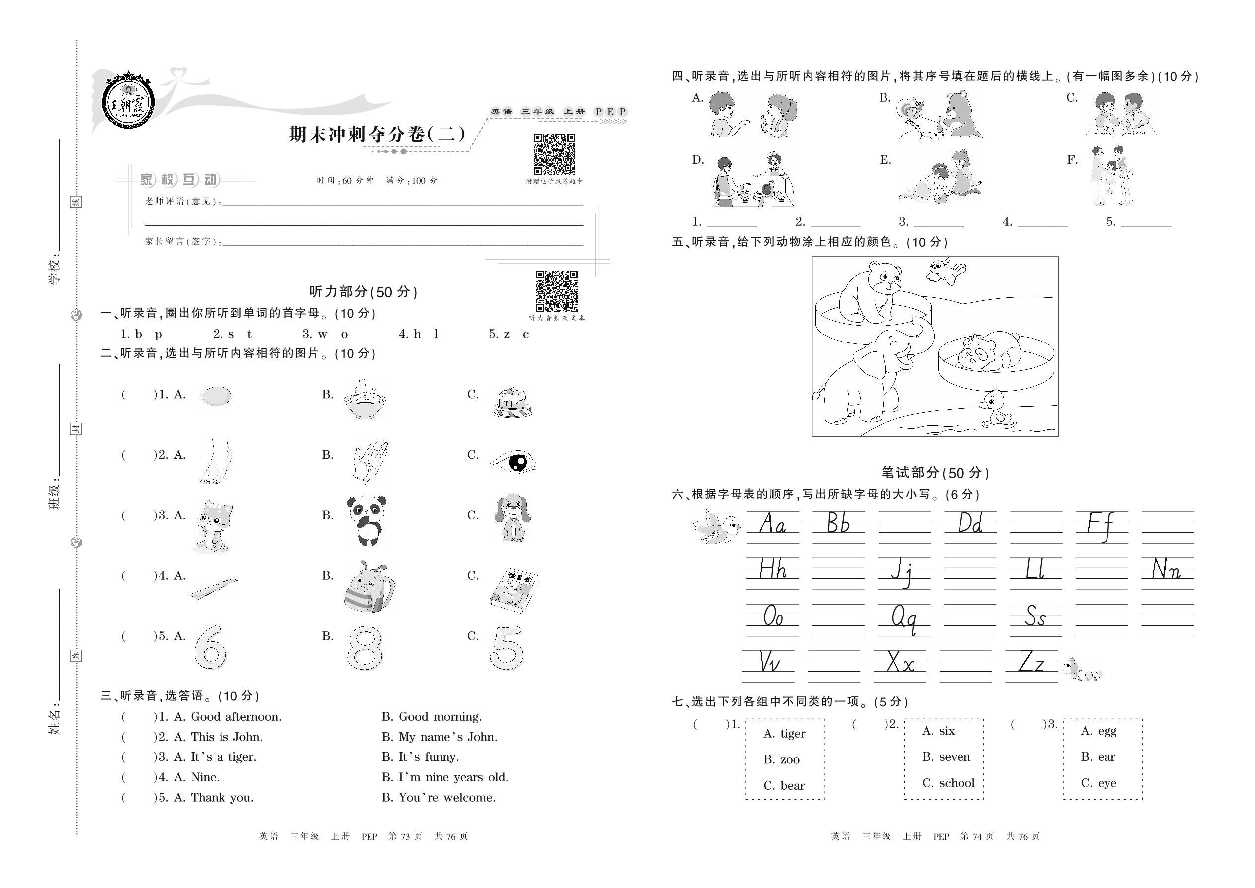 三年级英语人教PEP版(三起始)上册期末卷