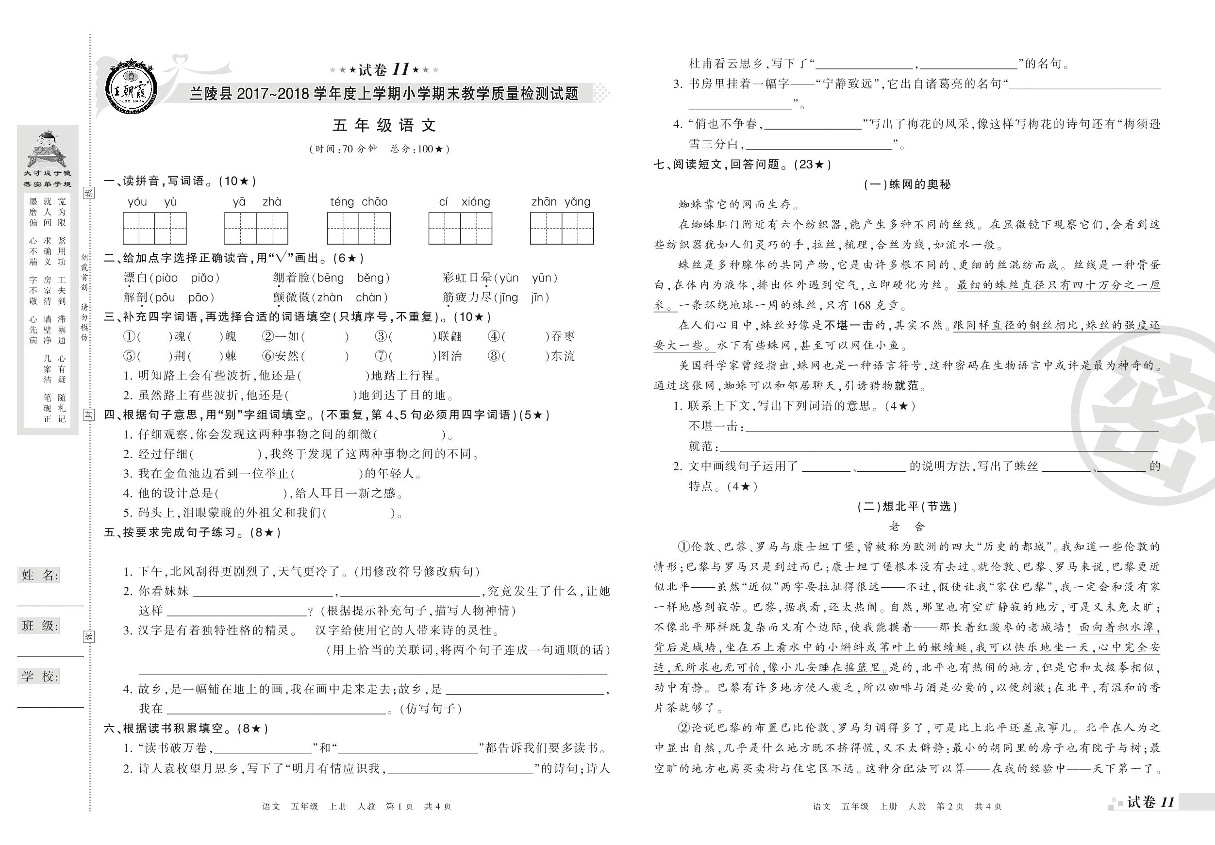 2017-2018学年第一学期临沂市兰陵县五年级语文试卷(人教版)【11】