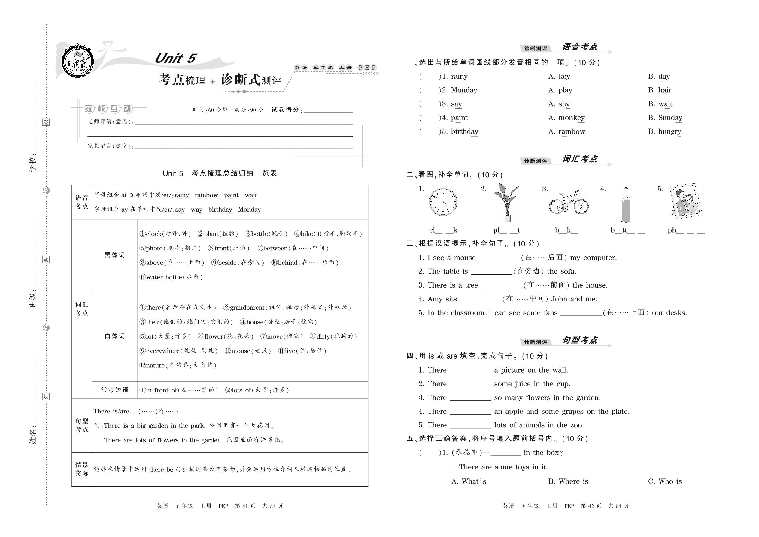2021上册五年级英语人教PEP版 Unit 5 考点梳理 + 诊断式测评