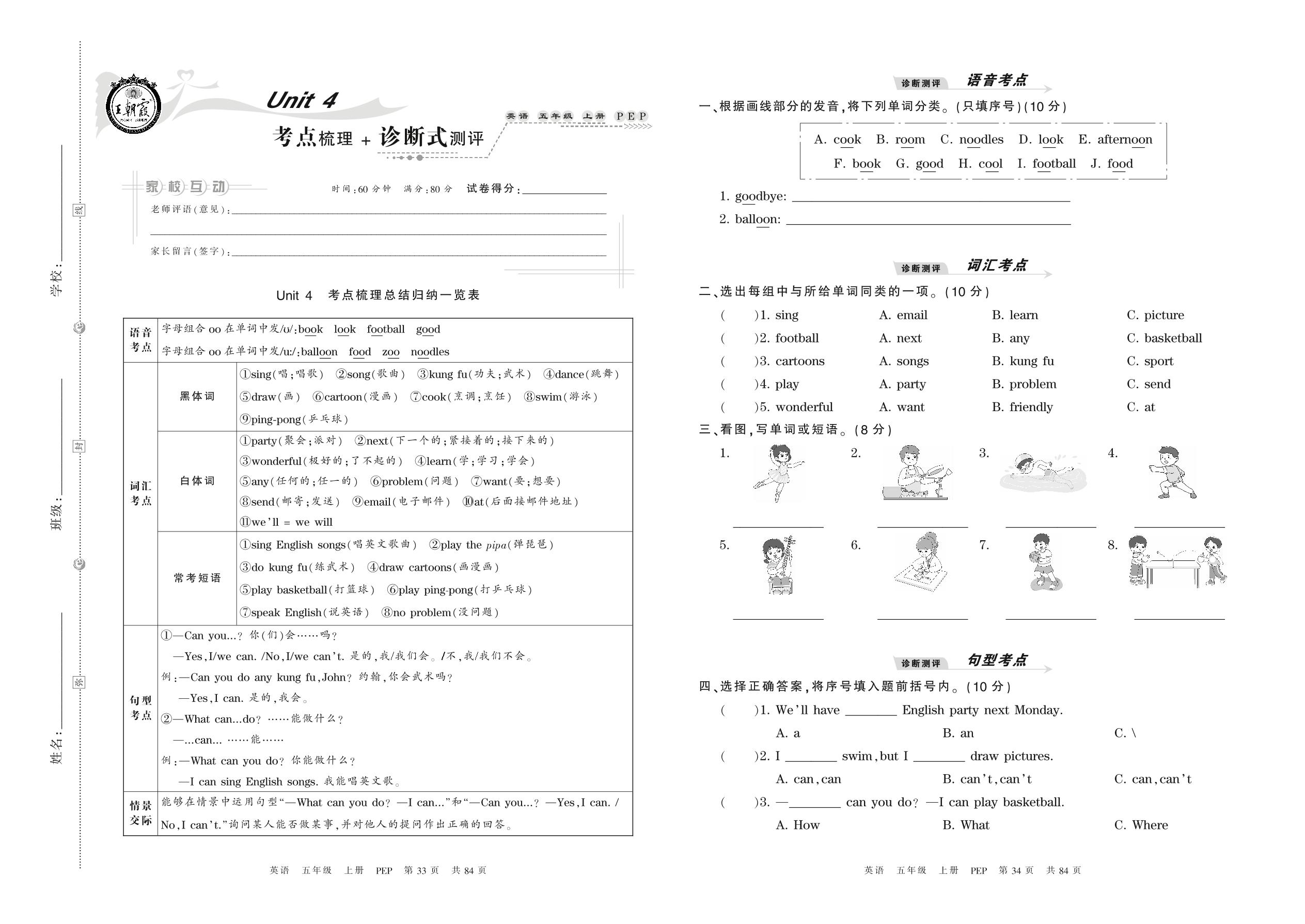 2021上册五年级英语人教PEP版 Unit 4 考点梳理 + 诊断式测评
