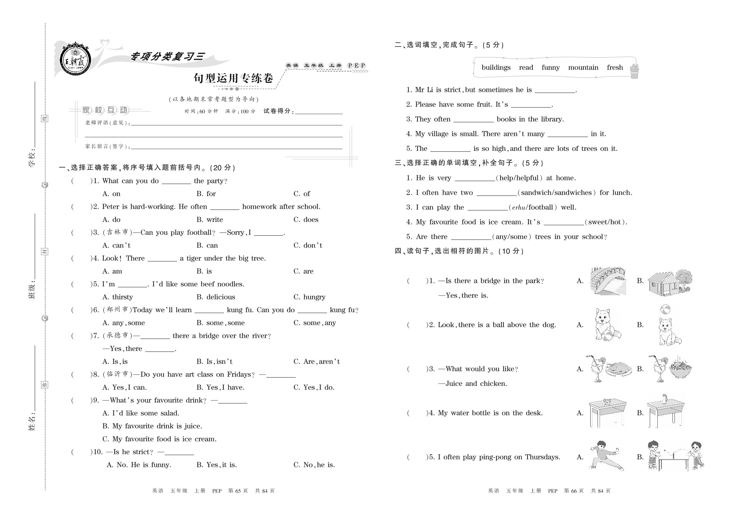 2021上册五年级英语人教PEP版 句型运用专练卷