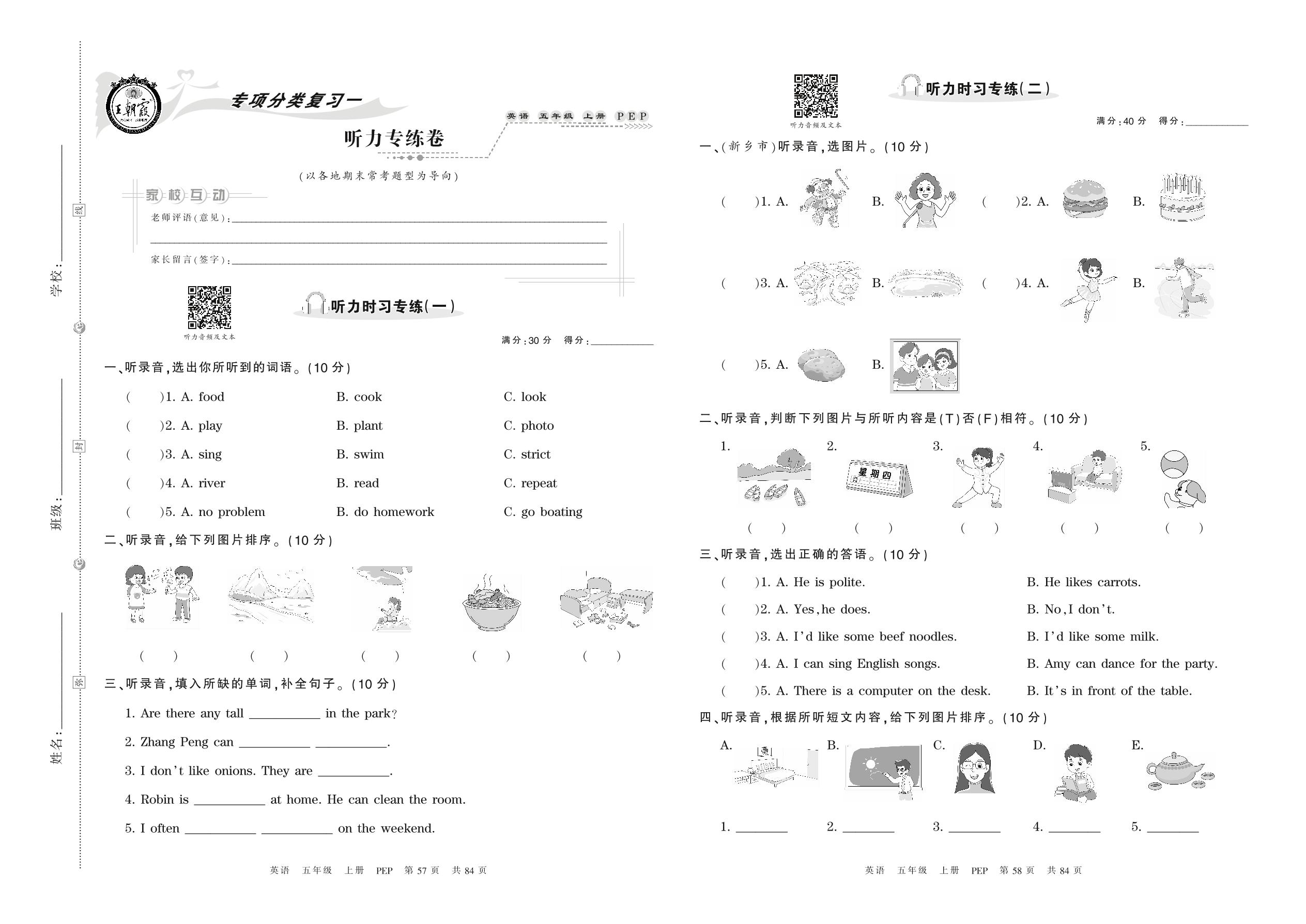 2021上册五年级英语人教PEP版 听力专练卷