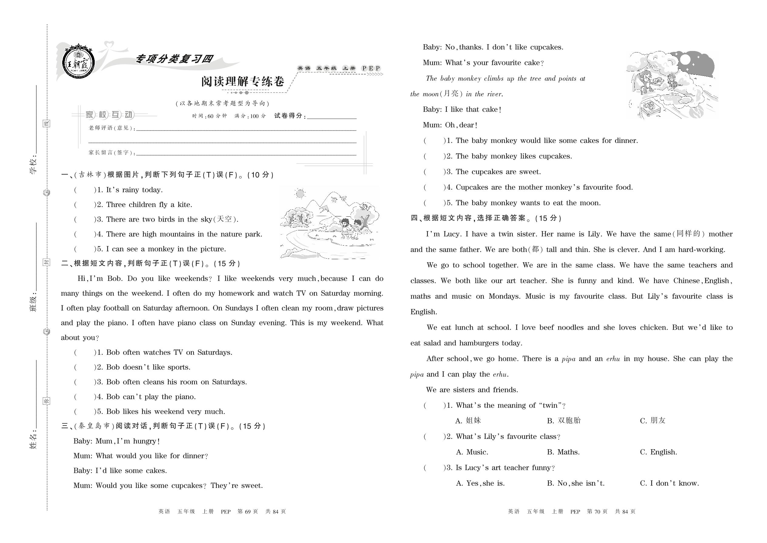 五年级英语人教PEP版(三起始)上册专项卷