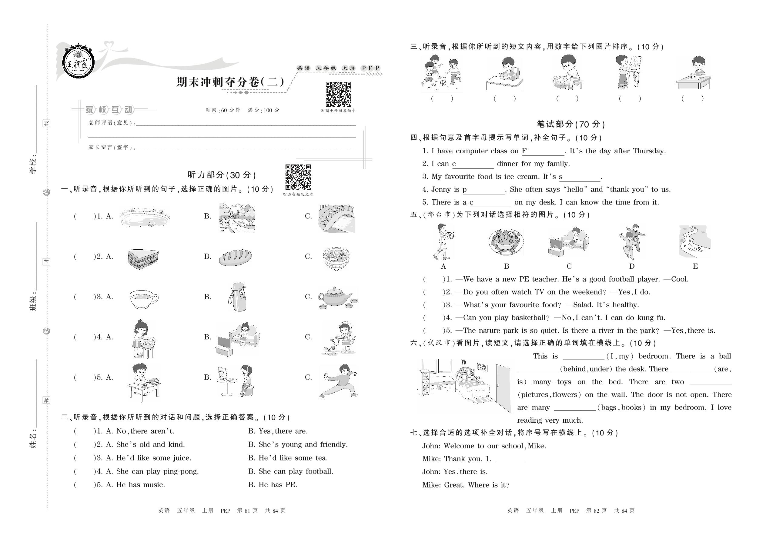 五年级英语人教PEP版(三起始)上册期末卷