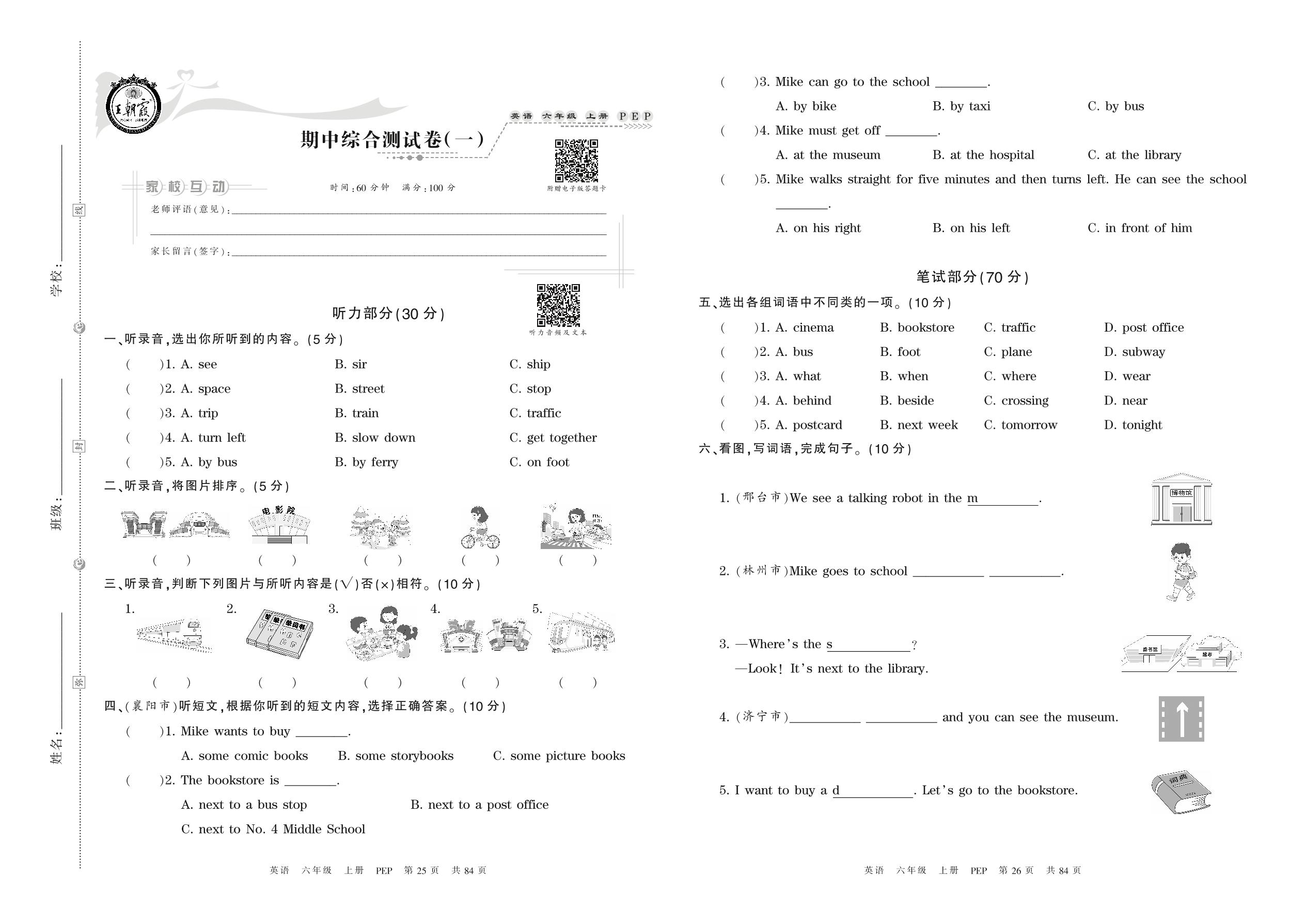 2021上册六年级英语人教PEP版 期中综合测试卷(一)