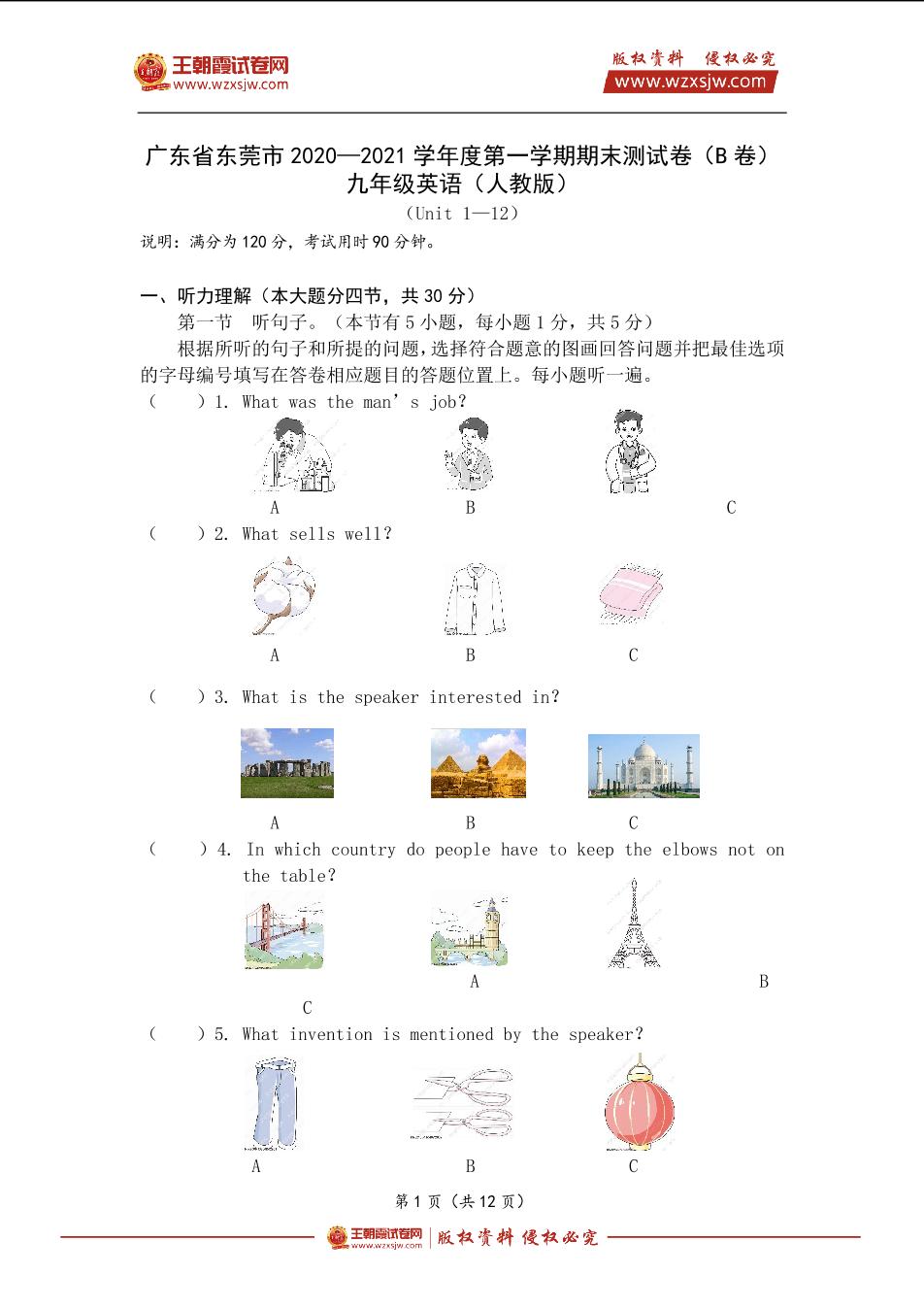 广东省东莞市2020—2021学年度第一学期期末测试卷(B卷)九年级英语(人教版)【无听力音频】