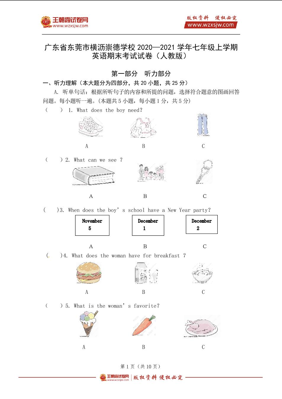 广东省东莞市横沥崇德学校2020—2021学年上学期期末考试七年级英语试卷(人教版)【无听力音频】