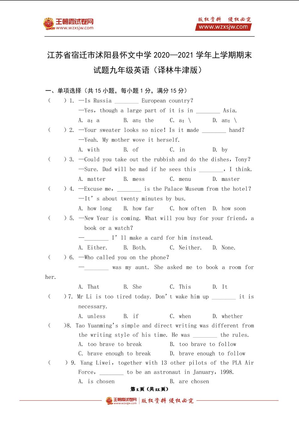 江苏省宿迁市沭阳县怀文中学2020—2021学年九年级上学期期末英语试题(译林牛津版)【无听力音频】