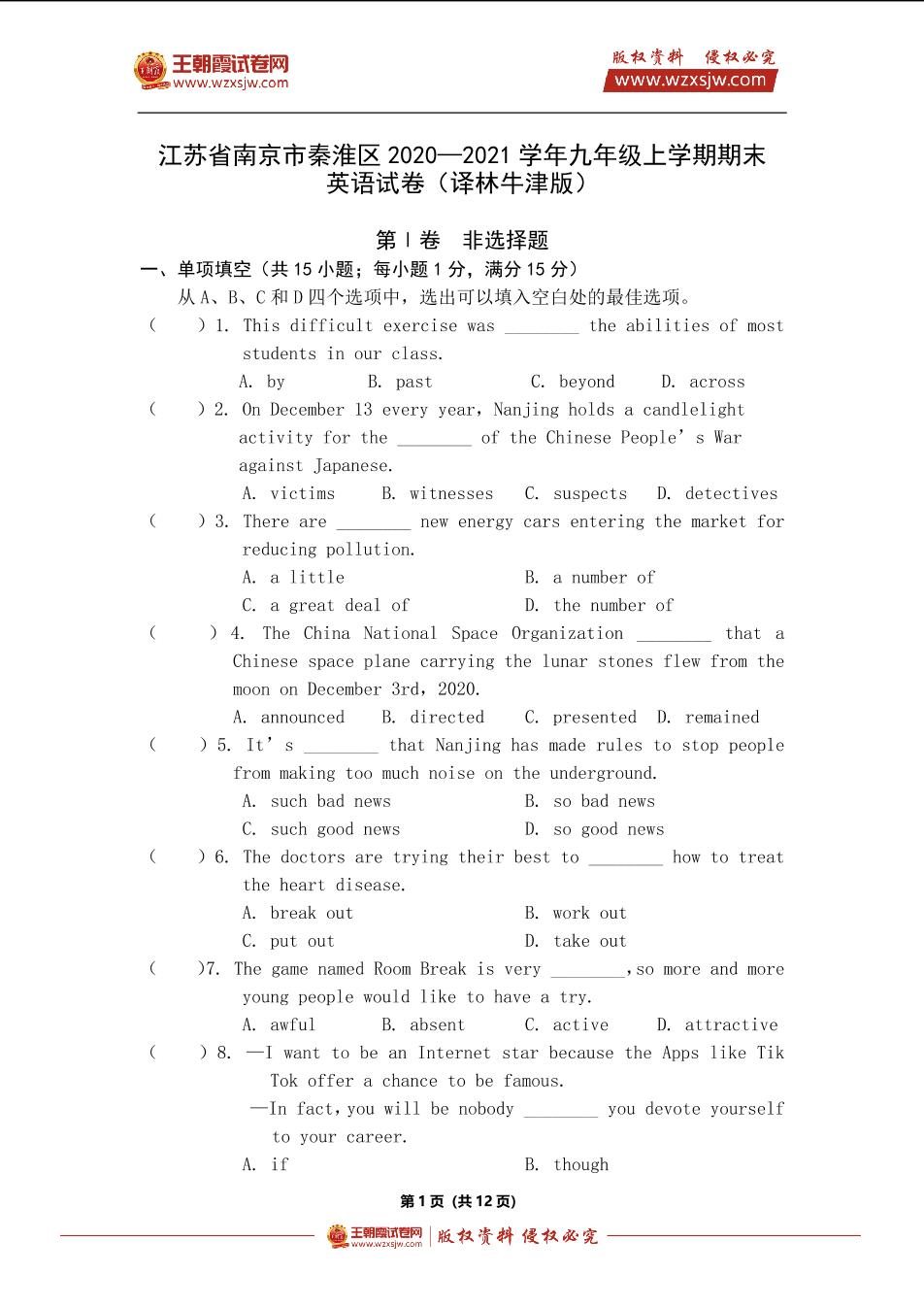 江苏省南京市秦淮区2020—2021学年九年级上学期期末英语试题(译林牛津版)【无听力音频】