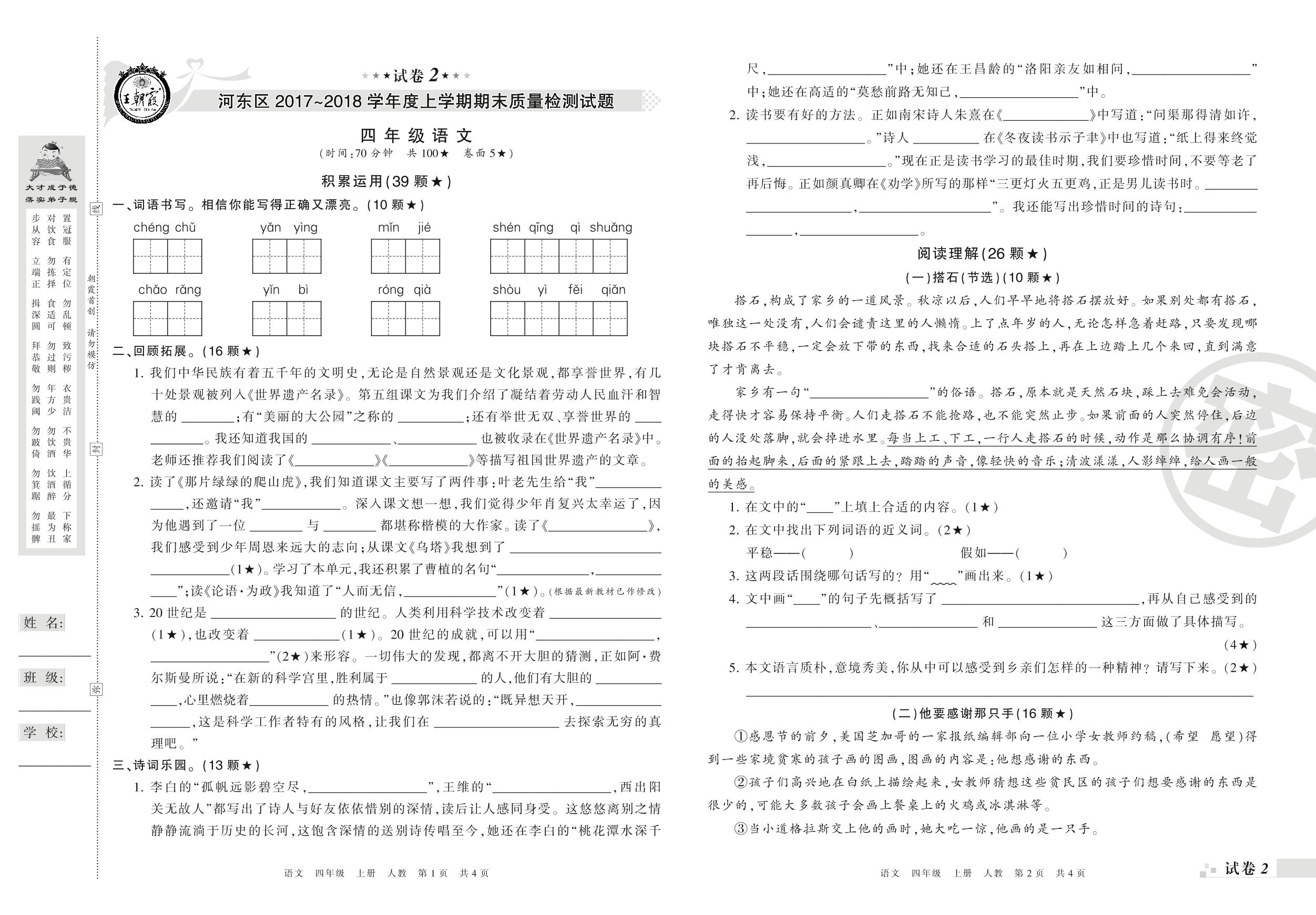 2017-2018学年第一学期临沂市河东区四年级语文试卷(人教版)【2】